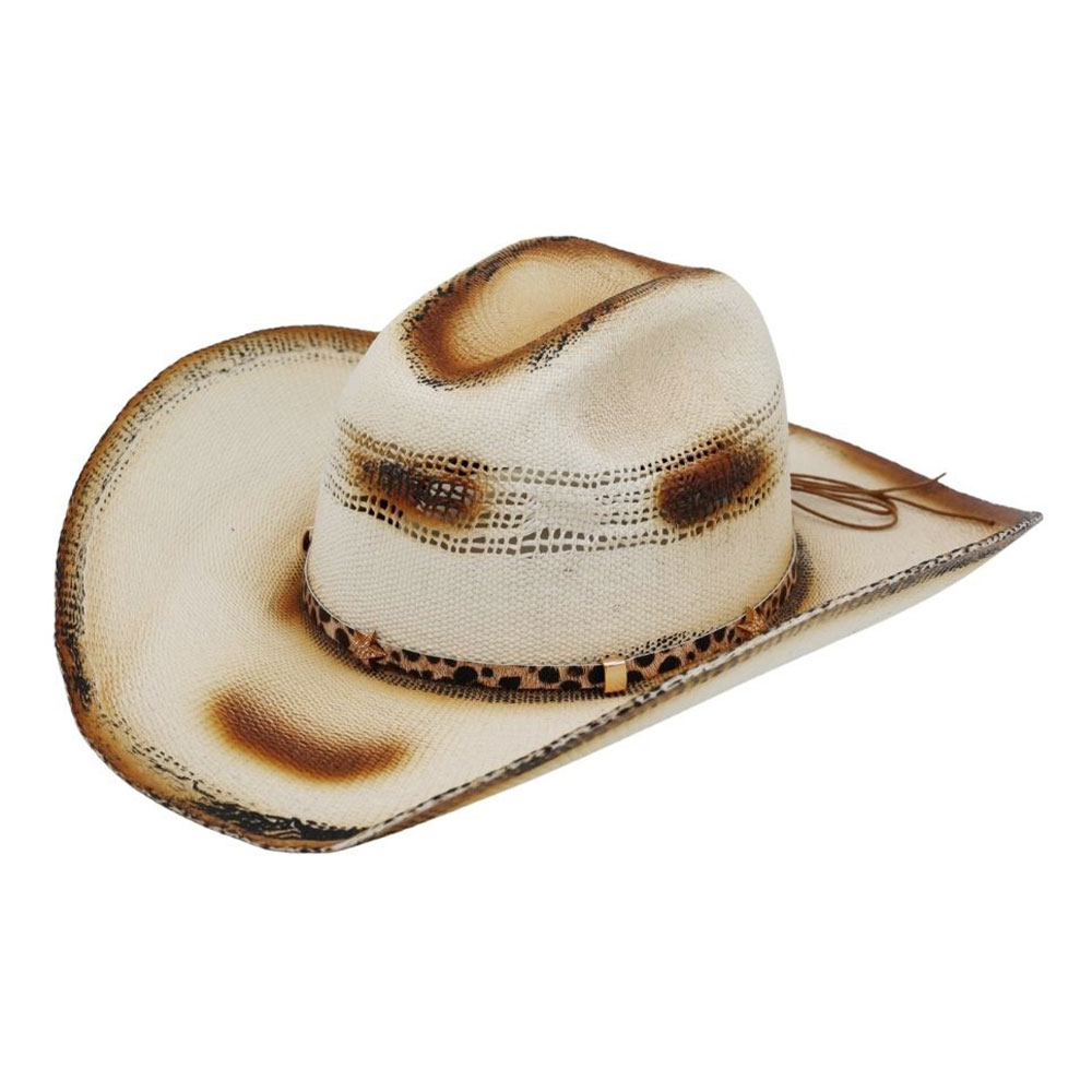 Star Accent Leopard Pattern Faux Leather Band Distressed Two Tone Western Straw Cowboy Hat