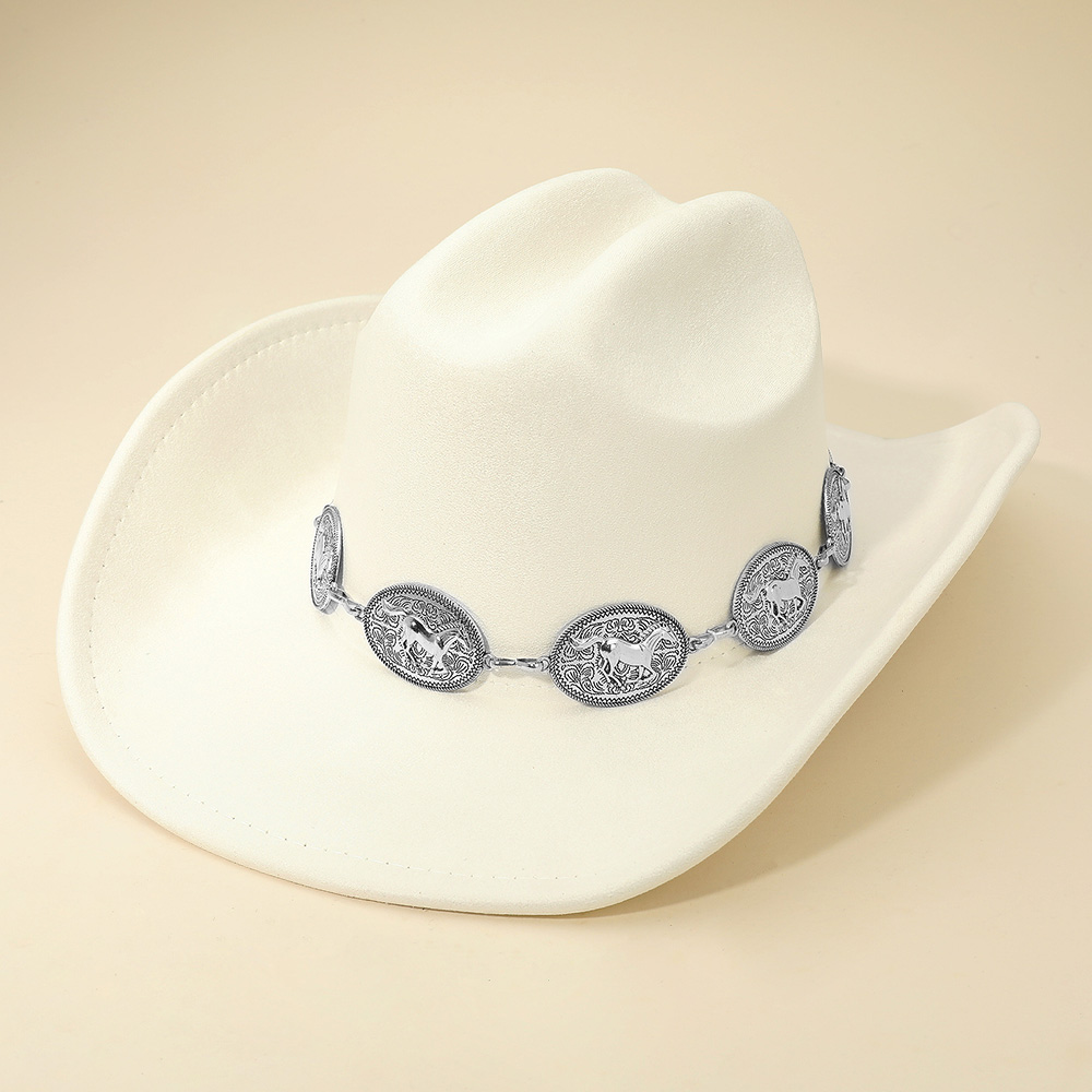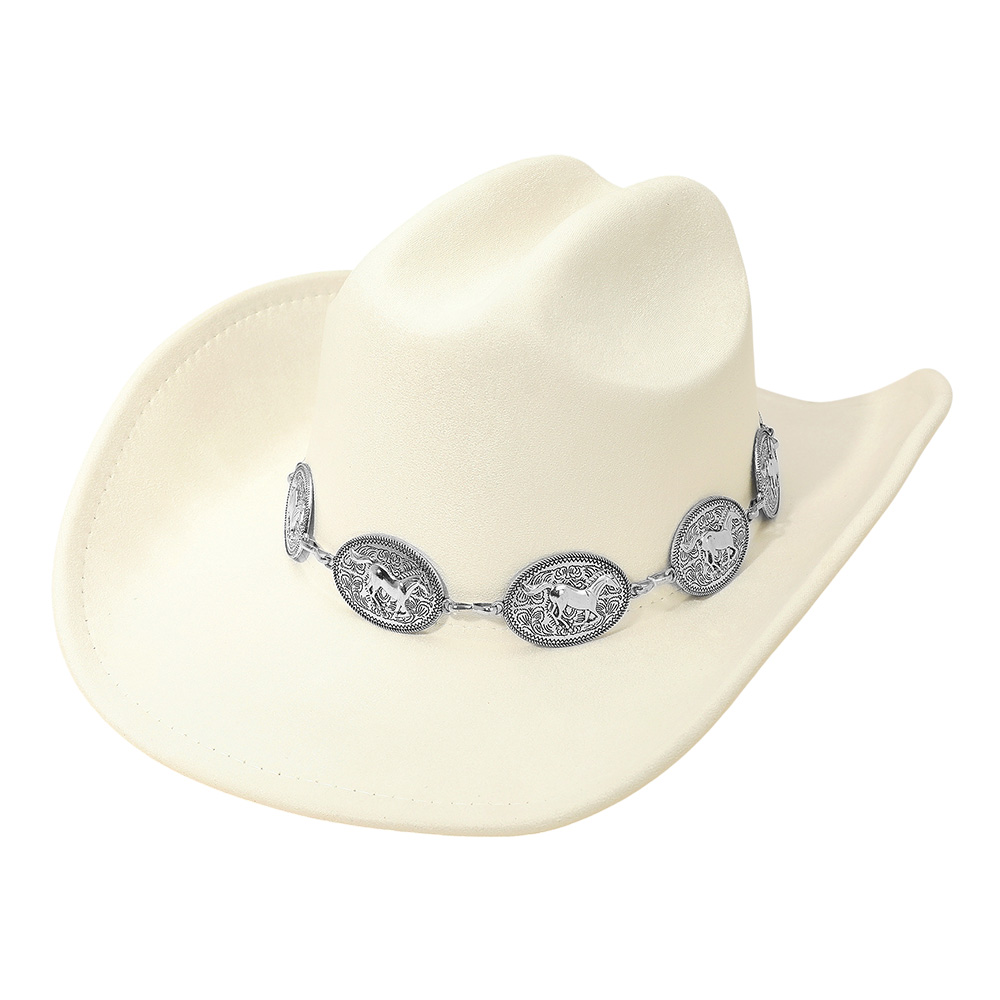 Details • Crown Circumference : 23" • Crown Height : 4.75" • Brim Height : 3.75" • Material : 100% Polyester • Classic cowboy hat featuring an oval concho chain band with engraved rodeo-inspired details. Designed for rodeos, concerts, festivals, or everyday western wear, this bold hat brings authentic cowboy style with a durable design and striking concho accents for standout western fashion.