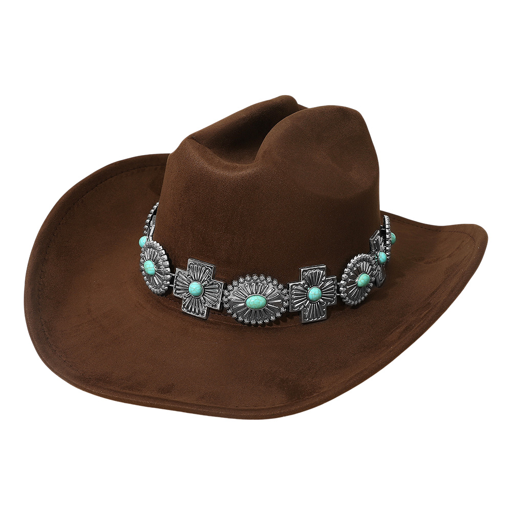 Details • Crown Circumference : 23" • Crown Height : 4.75" • Brim Height : 3.75" • Material : 100% Polyester • Classic western cowboy hat designed with a detailed concho band that adds bold character and unique flair. Perfect for festivals, rodeos, or casual style, this hat blends timeless tradition with standout fashion appeal, making it a versatile accessory for any western-inspired look.
