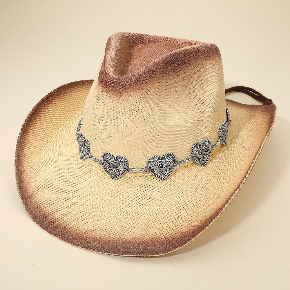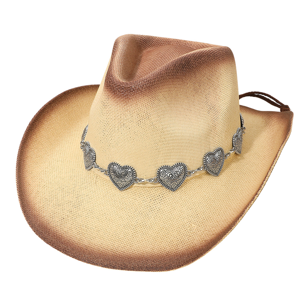 • Turn heads with this cowboy hat featuring a band of intricate heart conchos for a unique western look. Ideal for concerts, festivals, or casual wear, it combines rustic charm with eye-catching detail, making it the perfect accessory for a bold and stylish statement.