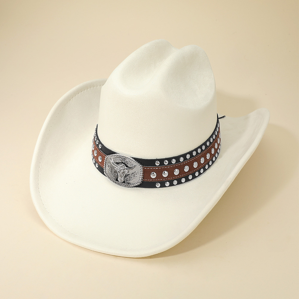 Details • Crown Circumference : 23" • Crown Height : 4.75" • Brim Height : 3.75" • Material : 100% Polyester • Western cowboy hat accented with a bold steer head buckle band, featuring studded details for a rugged finish. Perfect for rodeos, concerts, festivals, and everyday wear, this hat combines durability with authentic cowboy style, making it a standout piece in western fashion collections.