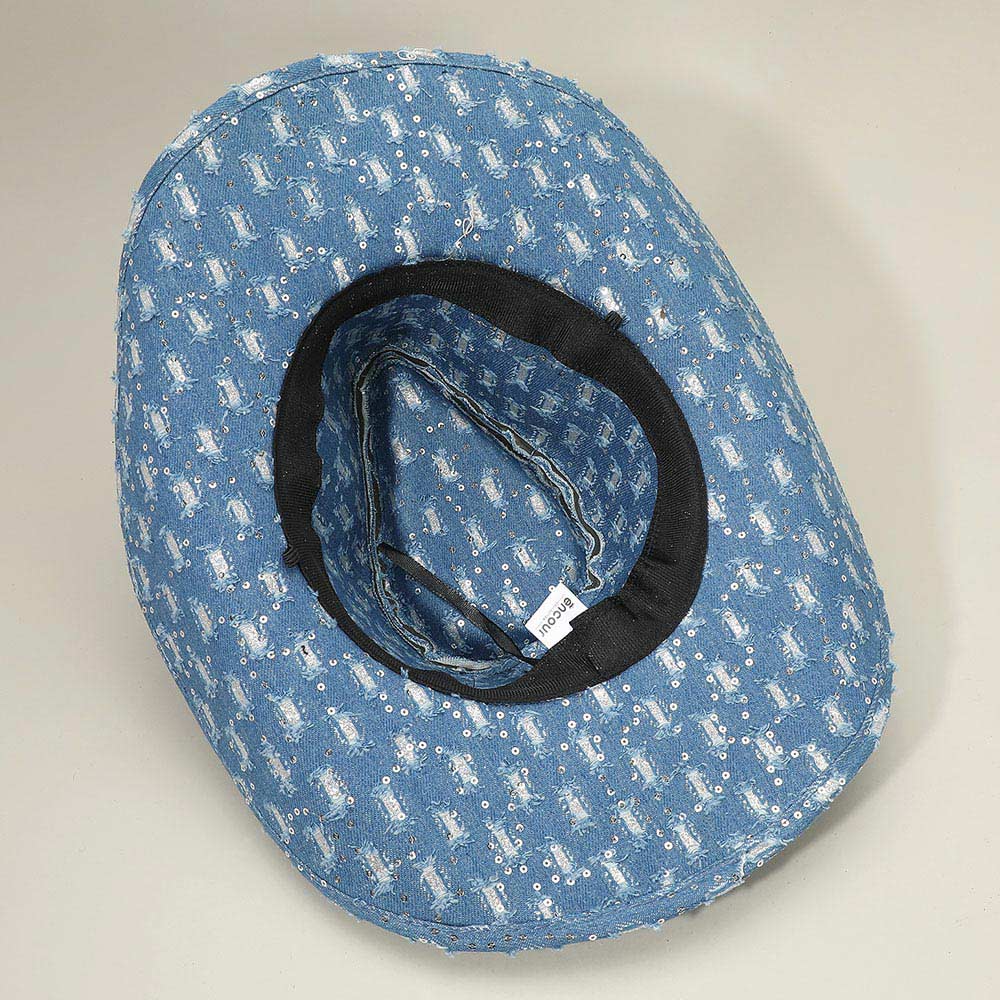 Wide Brim Distressed Sequin Pattern Cowboy Fedora Hat