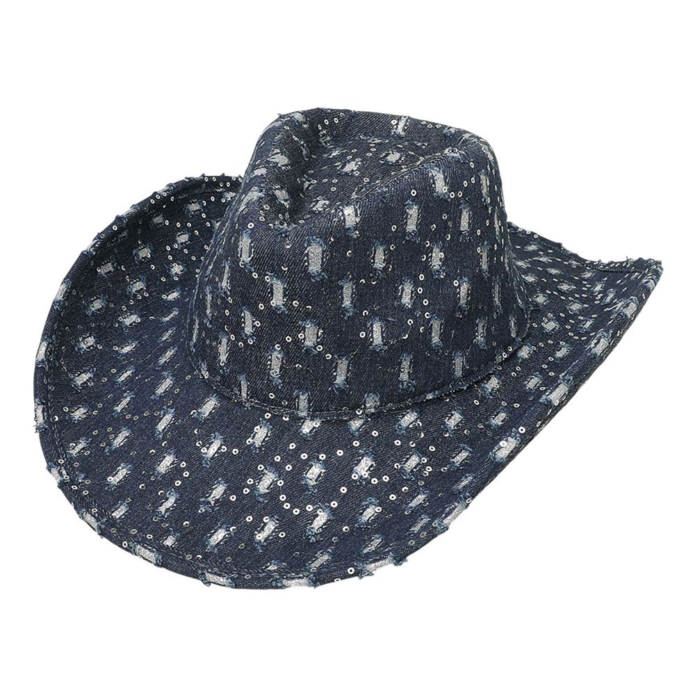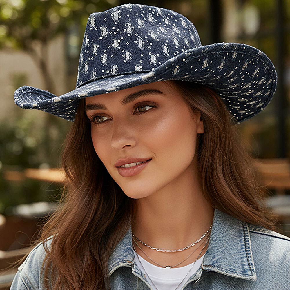Details • Crown Circumference : 23" • Crown Height : 4.5" • Brim Height : 3.75" • Material : 100% Cotton • Statement cowboy style hat featuring an allover sequin pattern with a structured crown and wide brim silhouette. Designed to elevate festival outfits, themed events, concerts, and costume styling, this eye catching accessory adds bold texture, visual impact, and standout appeal to any fashion or novelty collection