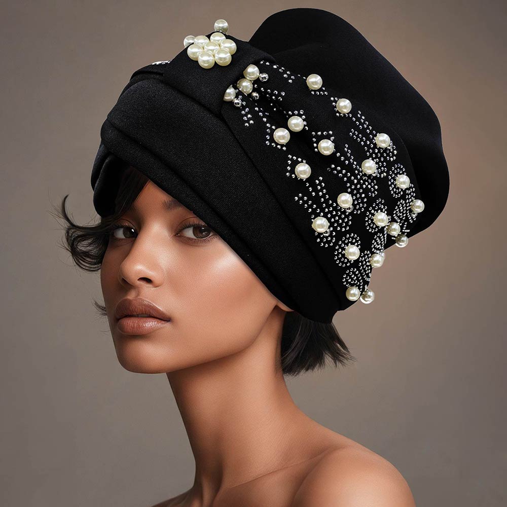 • Statement turban-style hat designed with dimensional shaping and elegant pearl-style embellishments for elevated styling. Ideal for special occasions, formal events, and boutique fashion collections, this headpiece delivers a polished silhouette with eye-catching texture and refined decorative detail.