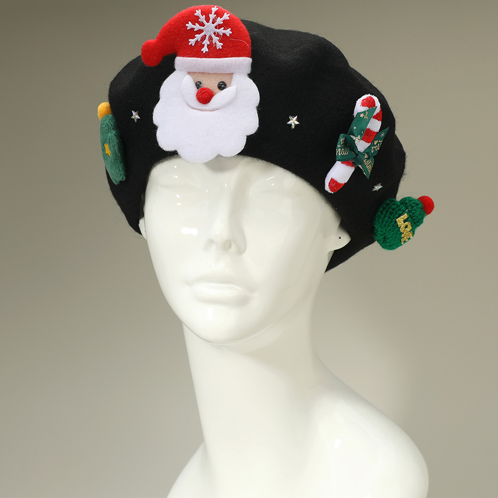 • Festive Christmas beret hat featuring a cheerful Santa design, candy cane, and holiday-themed details. A playful accessory perfect for parties, gatherings, and seasonal outfits. Add charm and holiday cheer to your winter look with this fun Christmas hat, ideal for gifting or festive celebrations.
