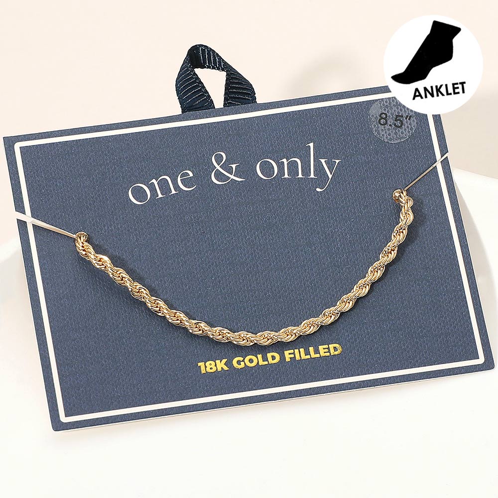 Details • Size : 0.1" H (3mm), 8.5" L • Lobster Clasp Closure • Elegant twisted rope chain anklet featuring a polished braided design that adds timeless shine and texture. Perfect for both casual and dressy looks, this anklet brings a touch of sophistication and effortless style to your everyday accessories collection. • Gold Filled • Lead and Nickel Compliant • Made In Brazil