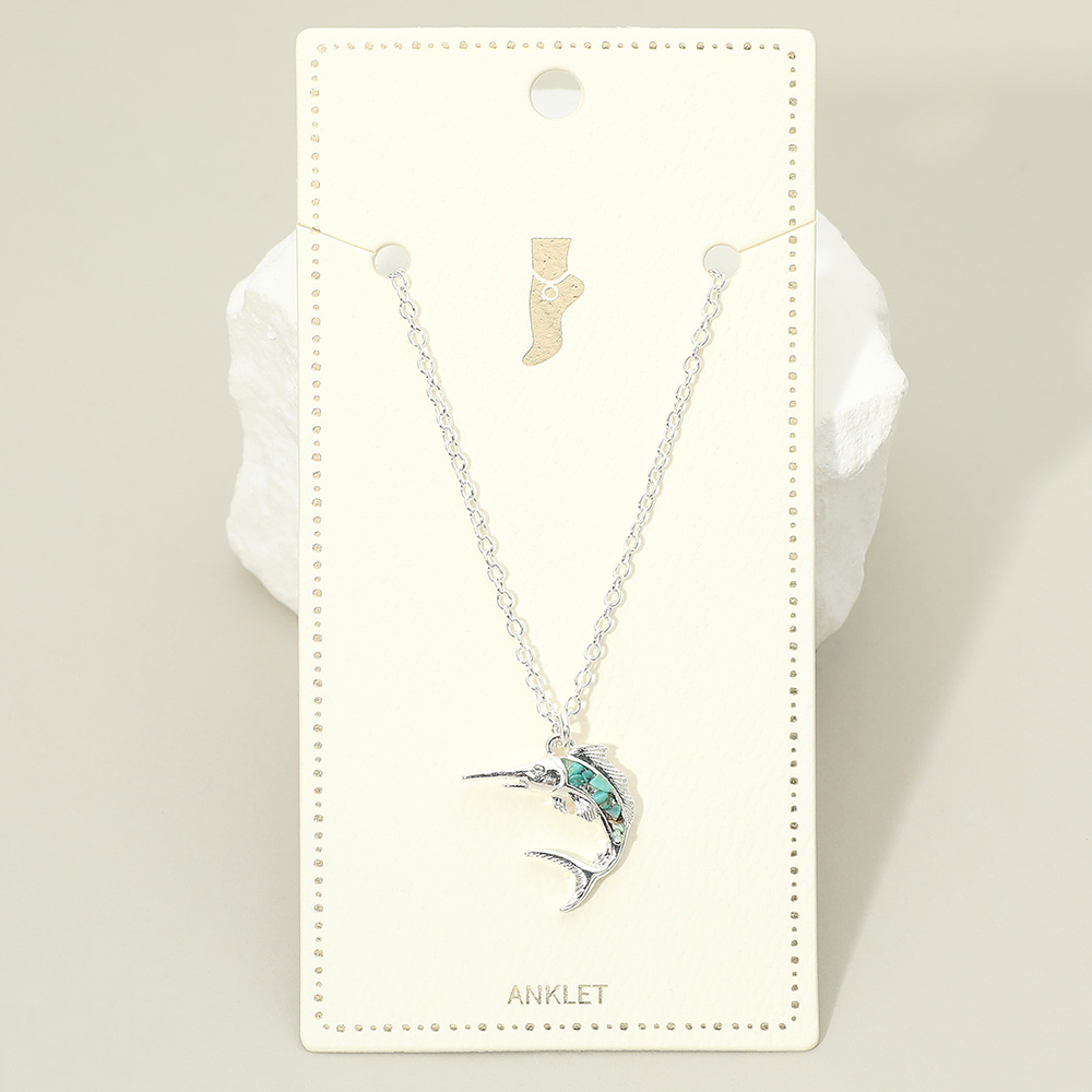 Details • Size : 9" + 1.5" L • Charm Size : 0.75" X 1" • Lobster Clasp Closure • Crushed pebble swordfish charm anklet featuring a sleek ocean-inspired pendant that brings dynamic coastal style to ankle jewelry. Lightweight and comfortable for daily wear, this anklet is perfect for summer outfits, beach vacations, resort styling, and nautical-themed boutique jewelry collections. • Lead and Nickel Compliant