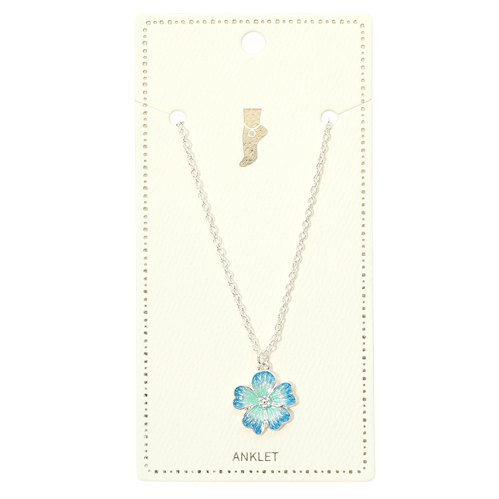 Details • Size : 9" + 1.5" L • Charm Size : 0.6" X 0.75" • Lobster Clasp Closure • Flower charm anklet featuring a soft nature-inspired floral design that adds feminine charm and gentle movement to ankle styling. Perfect for spring and summer collections, casual outfits, beachwear, and giftable assortments, this anklet appeals to customers seeking elegant, lightweight fashion jewelry with a fresh and timeless botanical feel. • Lead and Nickel Compliant