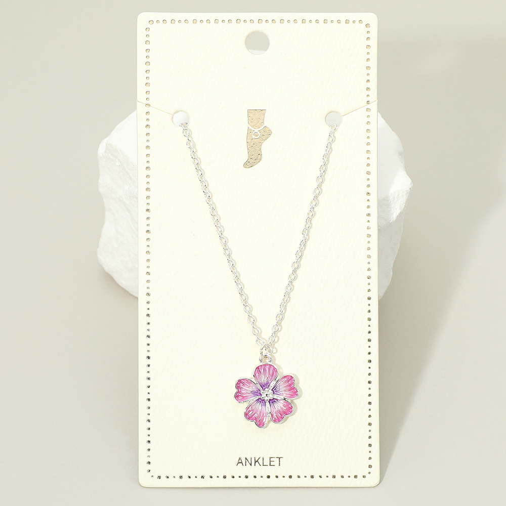 Details • Size : 9" + 1.5" L • Charm Size : 0.6" X 0.75" • Lobster Clasp Closure • Flower charm anklet featuring a soft nature-inspired floral design that adds feminine charm and gentle movement to ankle styling. Perfect for spring and summer collections, casual outfits, beachwear, and giftable assortments, this anklet appeals to customers seeking elegant, lightweight fashion jewelry with a fresh and timeless botanical feel. • Lead and Nickel Compliant