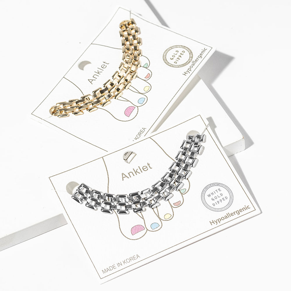 Details • Size : 0.4" H, 8.5" + 2" L • Lobster Clasp Closure • Elegant double layer box chain anklet designed with a sleek, modern touch. Perfect for adding subtle glamour to casual or dressy looks, this stylish ankle bracelet enhances your outfit with refined simplicity and timeless appeal, ideal for everyday wear or special occasions. • Gold Dipped • Hypoallergenic • Lead and Nickel Compliant • Made In Korea