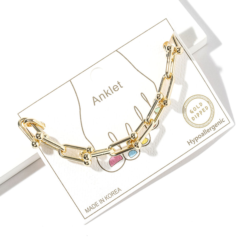 • This trendy anklet features elongated paperclip-style links accented with polished bead details for added dimension. Gold-dipped and hypoallergenic, it delivers both style and comfort—perfect for everyday wear or layering with other anklets for a bold, modern look.