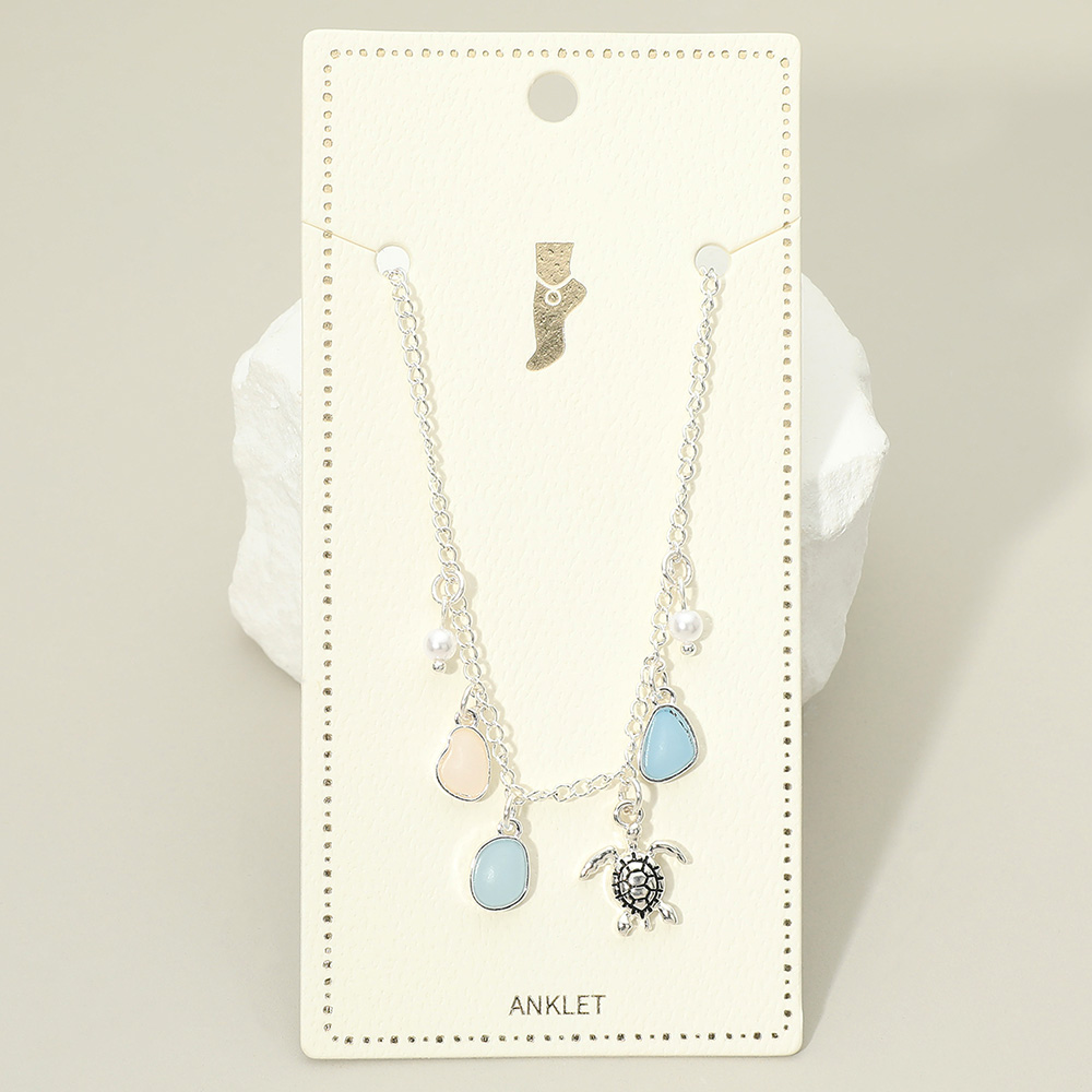 Details • Size : 0.6" H, 9.25" + 1.75" L • Lobster Clasp Closure • Sea turtle charm anklet featuring delicate dangling accents that create a relaxed, ocean-inspired look. Designed to highlight the ankle with subtle movement and charm, perfect for everyday wear or vacation styling. Ideal for gifting or boutique collections focused on coastal and nature-themed fashion jewelry. • Lead and Nickel Compliant