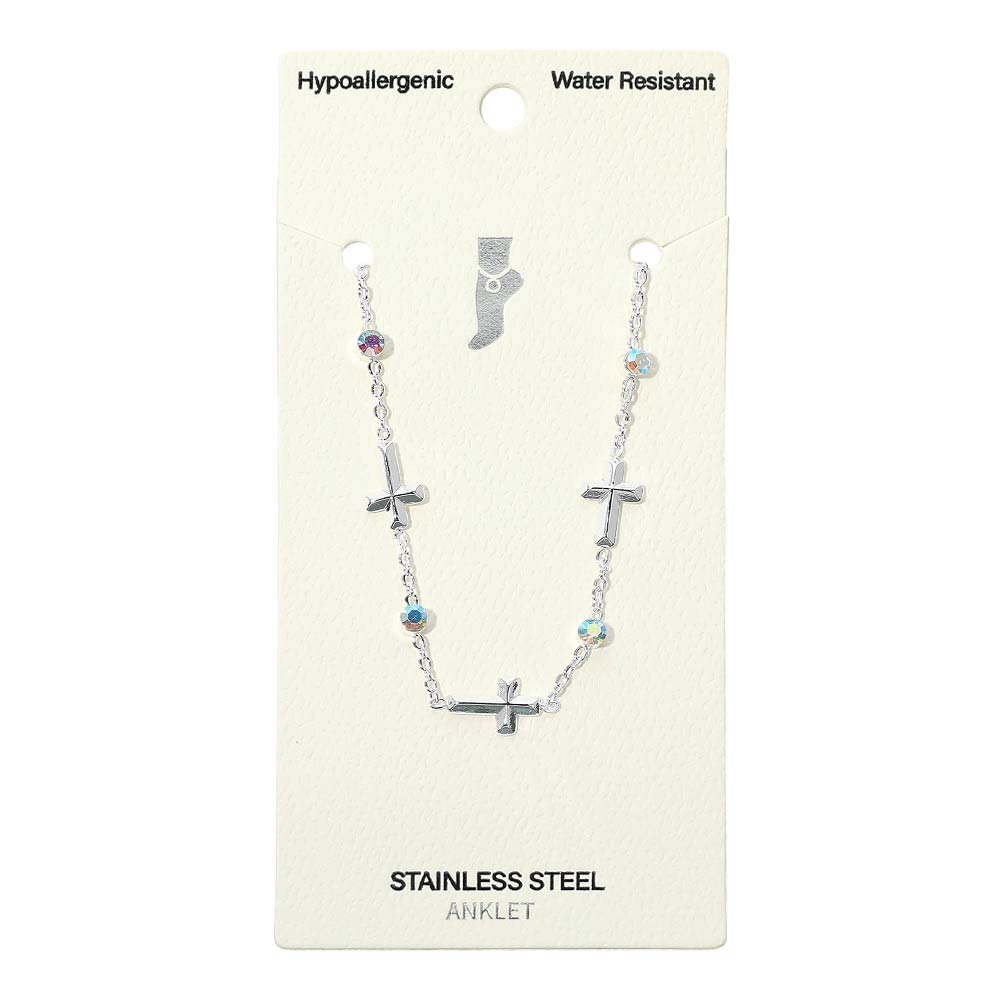 Details • Size : 0.3" H, 9.25" + 1.5" L • Lobster Clasp Closure • Water Resistant • Elegant chain anklet accented with cross charms and subtle crystal details for a meaningful yet stylish look. Designed for everyday wear, this anklet offers a lightweight feel and refined shine, making it perfect for casual outfits, special occasions, or layered jewelry styling. • Hypoallergenic • Stainless Steel