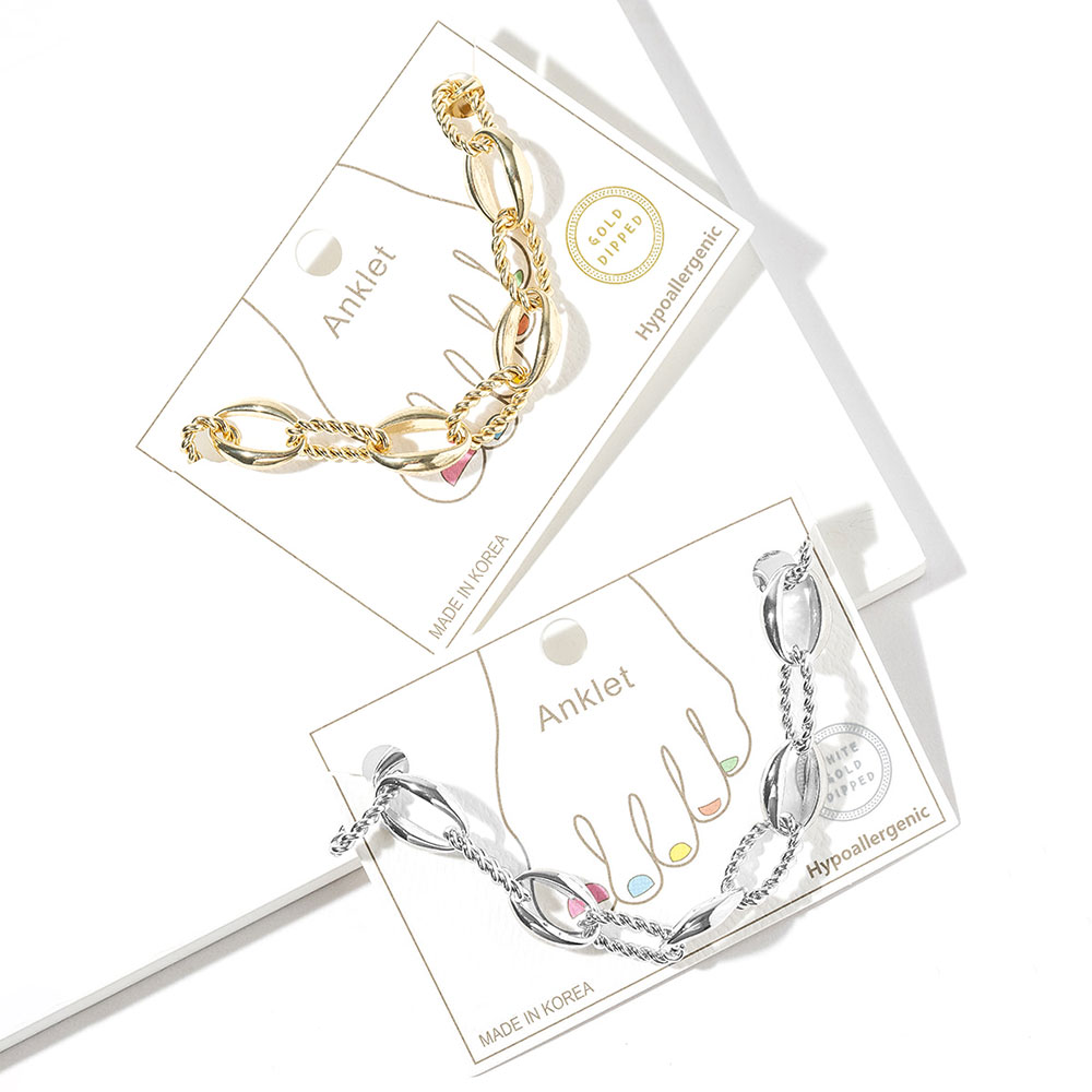 Details • Size : 0.3" H, 8.5" + 2.5" L • Lobster Clasp Closure • Stylish mixed-link anklet designed to elevate everyday and vacation looks. Featuring a bold combination of smooth and twisted links, this ankle bracelet adds eye-catching texture and movement. Ideal for layering or wearing solo, it pairs effortlessly with sandals, flats, or heels for a modern, fashion-forward finish. • Gold Dipped • Made In Korea