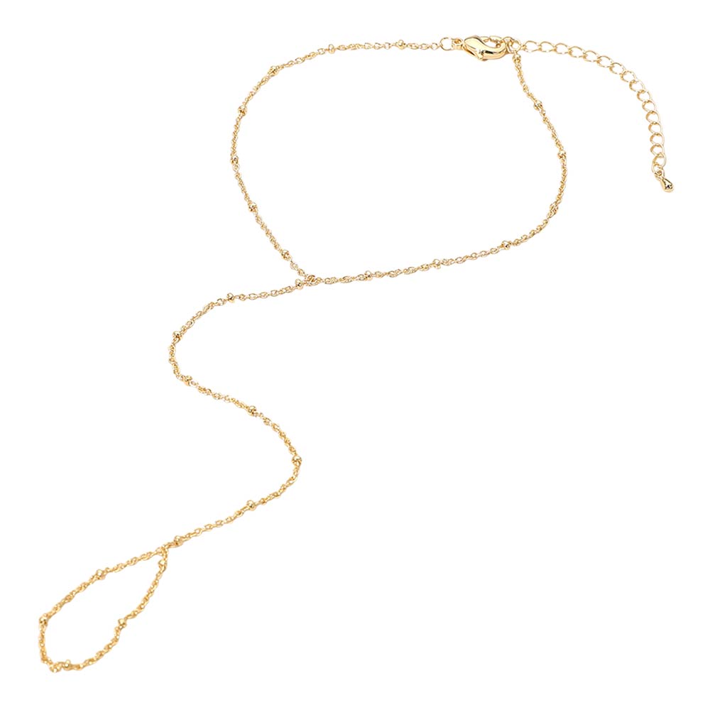 Details • Size : 5" H, 7.5" + 2.25" L • Ring Size : Free • Minimal hand chain bracelet featuring a slim wrist chain connected to a subtle finger ring for an elegant, modern look. Designed to sit comfortably on the hand, this refined piece adds graceful movement and visual interest. Ideal for boutique displays, gifting, special occasions, or everyday styling with a clean, feminine aesthetic. • Made In Korea