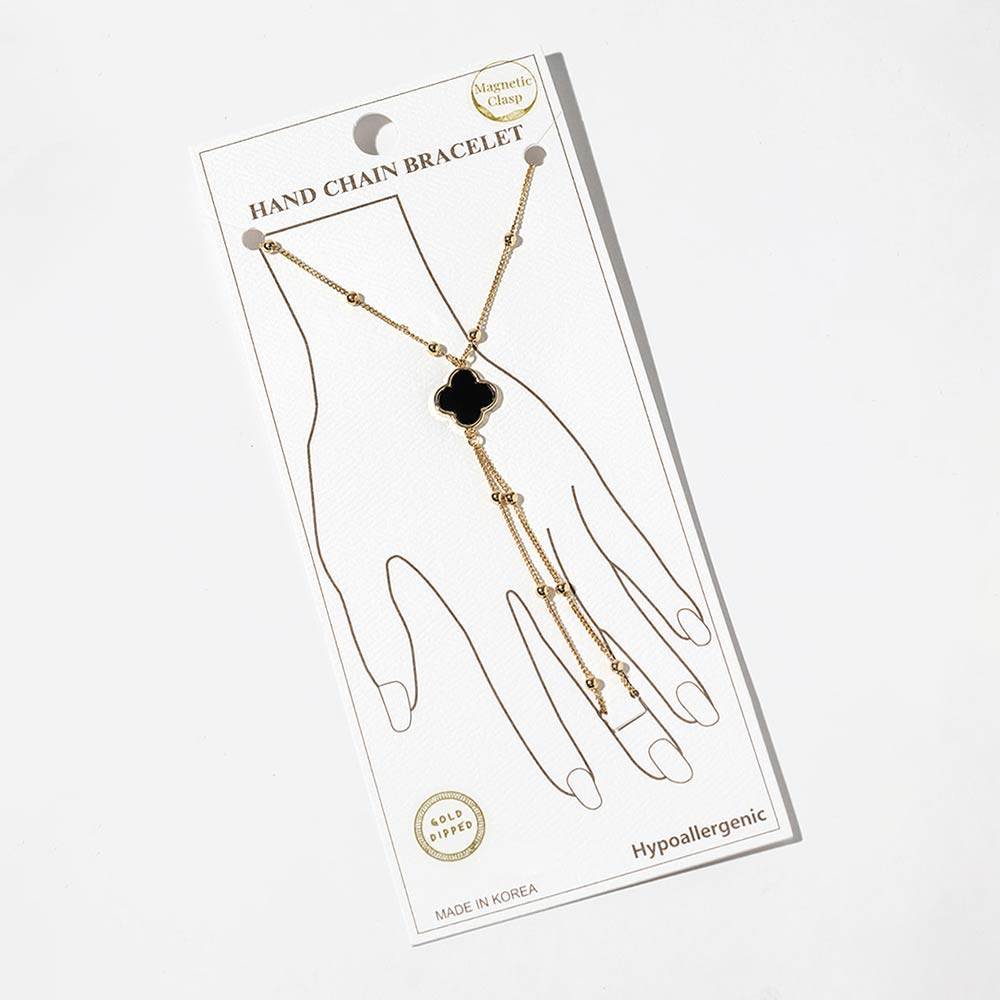 Details • Size : 0.8" H, 7" + 0.25" L • Ring Size : Free • Magnetic Clasp Closure • This stylish hand chain bracelet features a refined clover quatrefoil creates an elegant layered look. Finished with an easy magnetic clasp for comfortable wear, it adds a chic statement to everyday outfits, special occasions, and curated boutique jewelry collections. Designed to stand out while remaining versatile and wearable. • Gold Dipped • Hypoallergenic • Lead and Nickel Compliant • Made In Korea