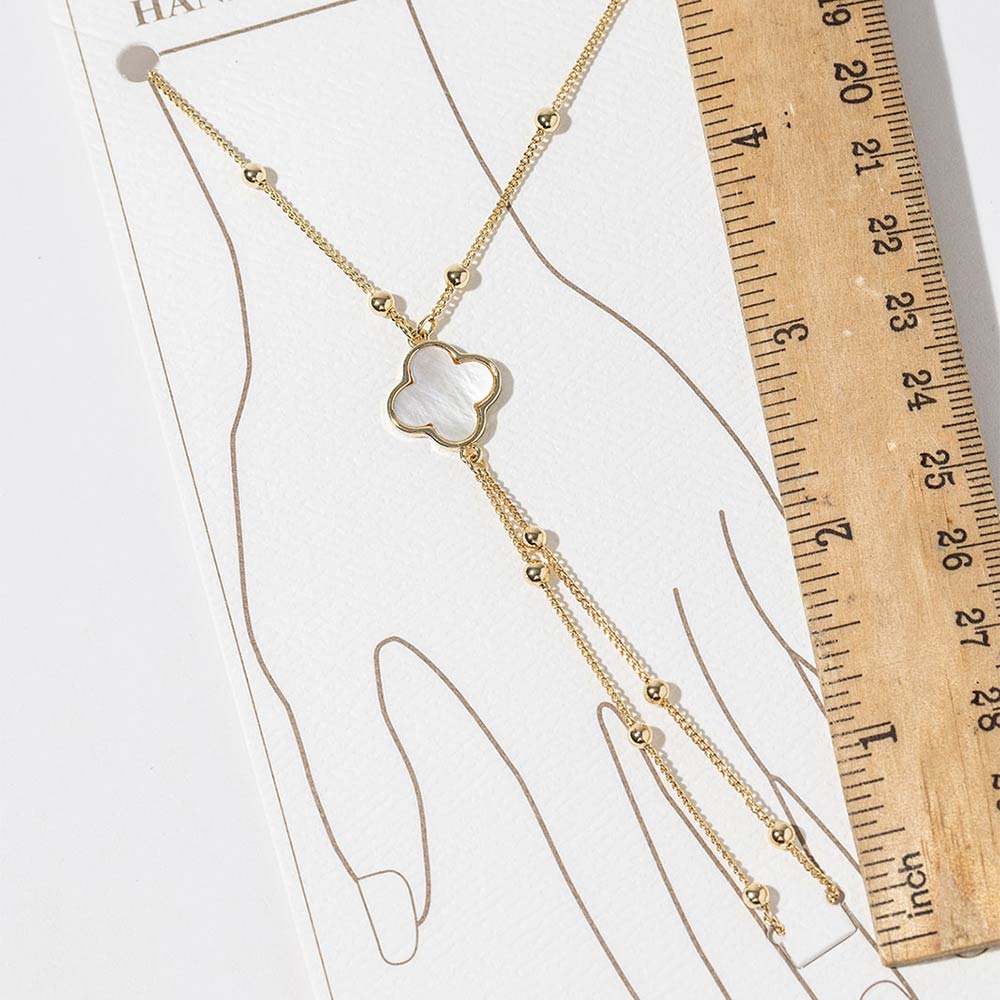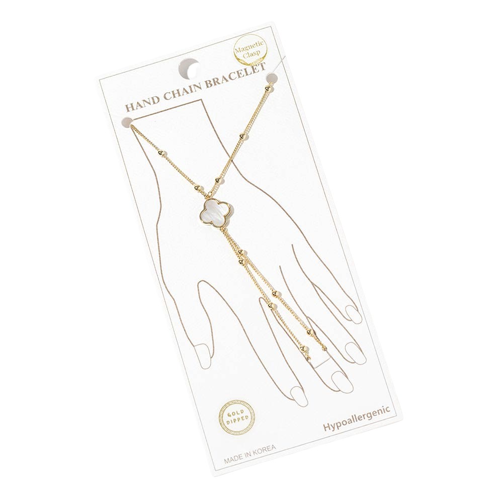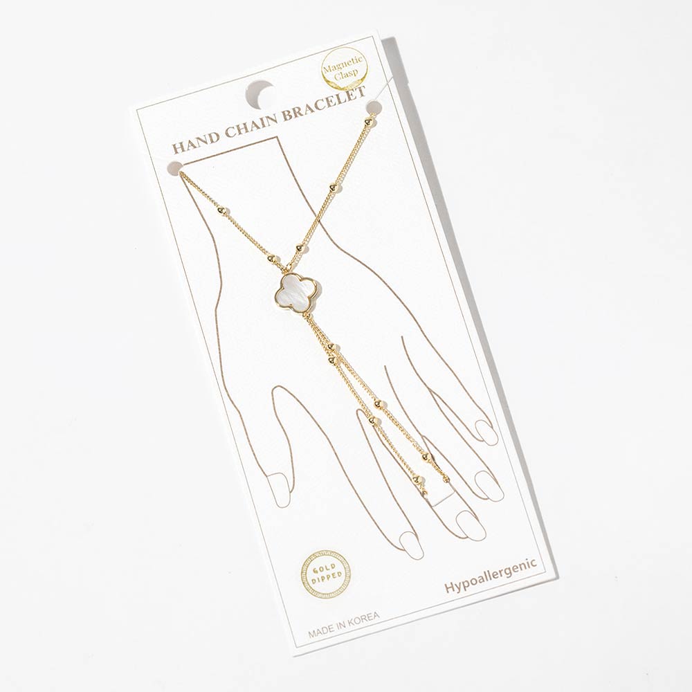Gold Dipped Beaded Mother of Pearl Quatrefoil Accent Hand Chain Magnetic Bracelet