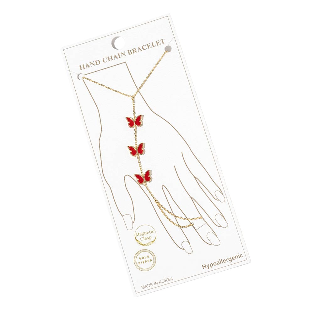 Details • Size : 3" H, 7" + 0.25" L • Ring Size : Free • Magnetic Clasp Closure • This butterfly hand chain bracelet features a delicate wrist-to-finger design accented with butterfly charms for a graceful, eye-catching look. Designed with a magnetic clasp for easy wear, it offers elegant movement and statement appeal. Ideal for boutique jewelry collections, layering styles, and everyday or special occasion accessorizing. • Gold Dipped • Hypoallergenic • Lead and Nickel Compliant • Made In Korea
