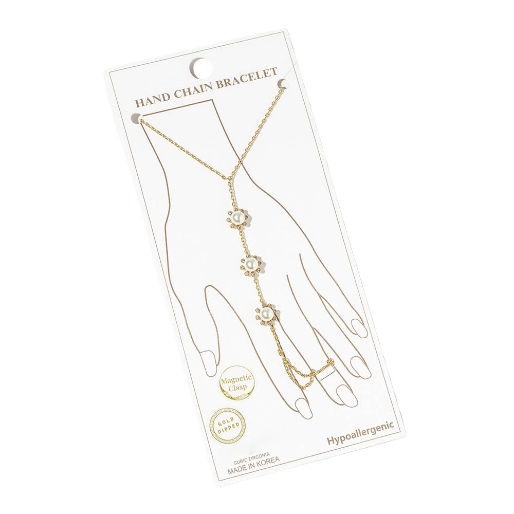 Details • Size : 3.5" H, 7" + 0.25" L • Ring Size : Free • Magnetic Clasp Closure • This floral hand chain bracelet features a delicate wrist-to-finger design accented with evenly spaced flower motifs for a soft, feminine look. Designed with a magnetic clasp for easy wear and secure fit, it offers elegant drape and comfortable movement. A versatile accessory ideal for boutique collections, layering displays, gifting assortments, and trend-driven jewelry styling. • CZ Cubic Zirconia • Gold Dipped • Hypoallergenic • Lead and Nickel Compliant • Made In Korea