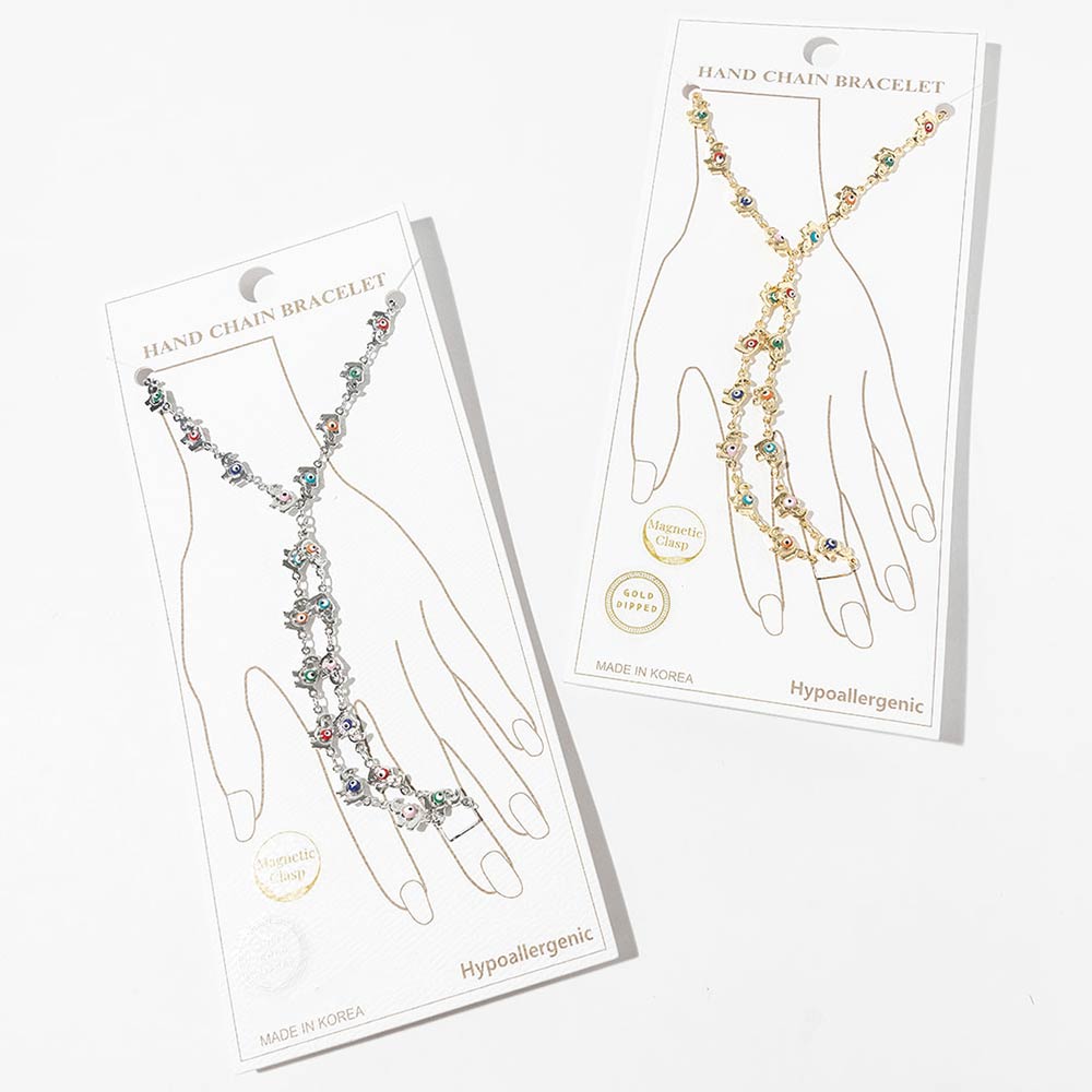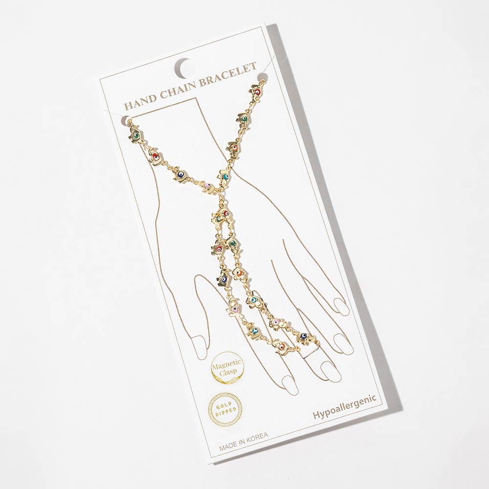 • This hand chain bracelet showcases a wrist-to-finger design accented with multiple elephant evil eye details for a symbolic, fashion-forward look. Designed with a magnetic clasp for easy wear, it delivers statement appeal for everyday outfits, resort styling, and curated boutique jewelry collections. Perfect for layering or wearing solo as a standout hand accessory.