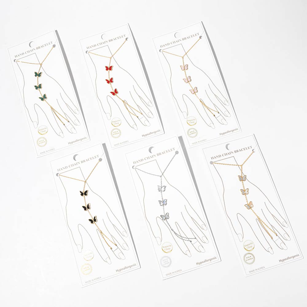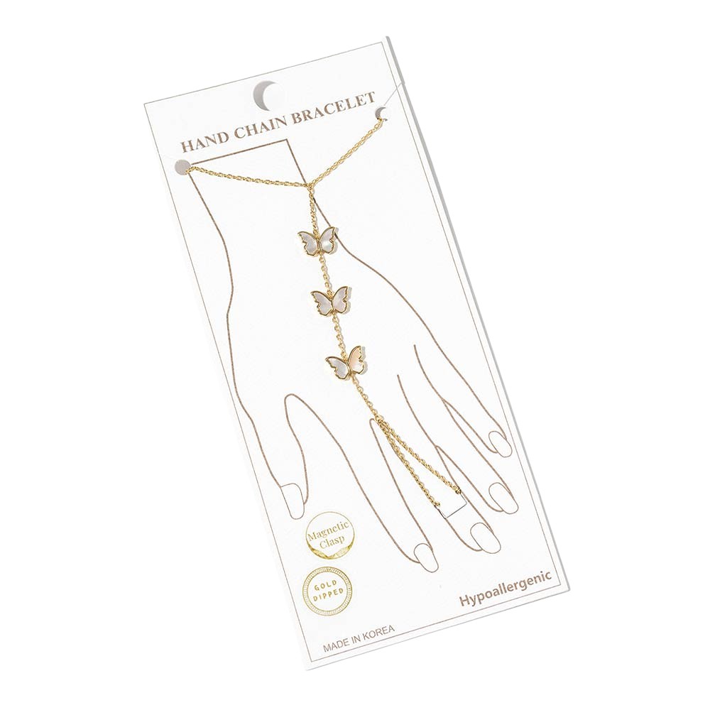 Details • Size : 3" H, 7" + 0.25" L • Ring Size : Free • Magnetic Clasp Closure • This butterfly hand chain bracelet features a delicate wrist-to-finger design accented with butterfly charms for a graceful, eye-catching look. Designed with a magnetic clasp for easy wear, it offers elegant movement and statement appeal. Ideal for boutique jewelry collections, layering styles, and everyday or special occasion accessorizing. • Gold Dipped • Hypoallergenic • Lead and Nickel Compliant • Made In Korea