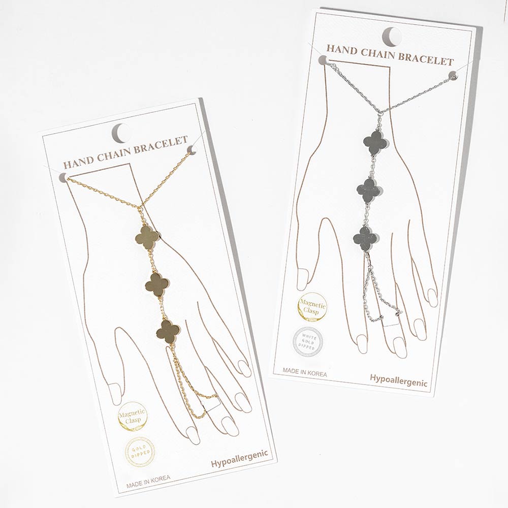 • This quatrefoil hand chain bracelet features a refined wrist-to-finger silhouette accented with multiple quatrefoil charms for a balanced, elegant look. Designed with a magnetic clasp for easy wear and secure fit, it offers graceful drape and everyday versatility. Ideal for boutique jewelry collections, layering styles, gifting displays, and trend-forward accessory assortments.