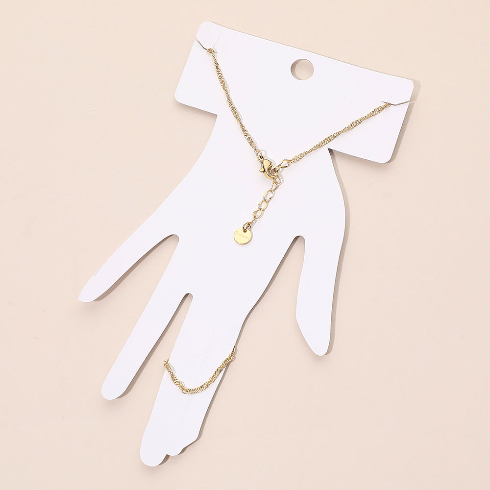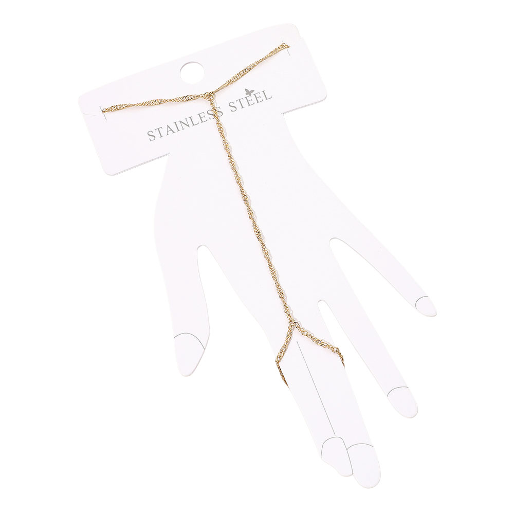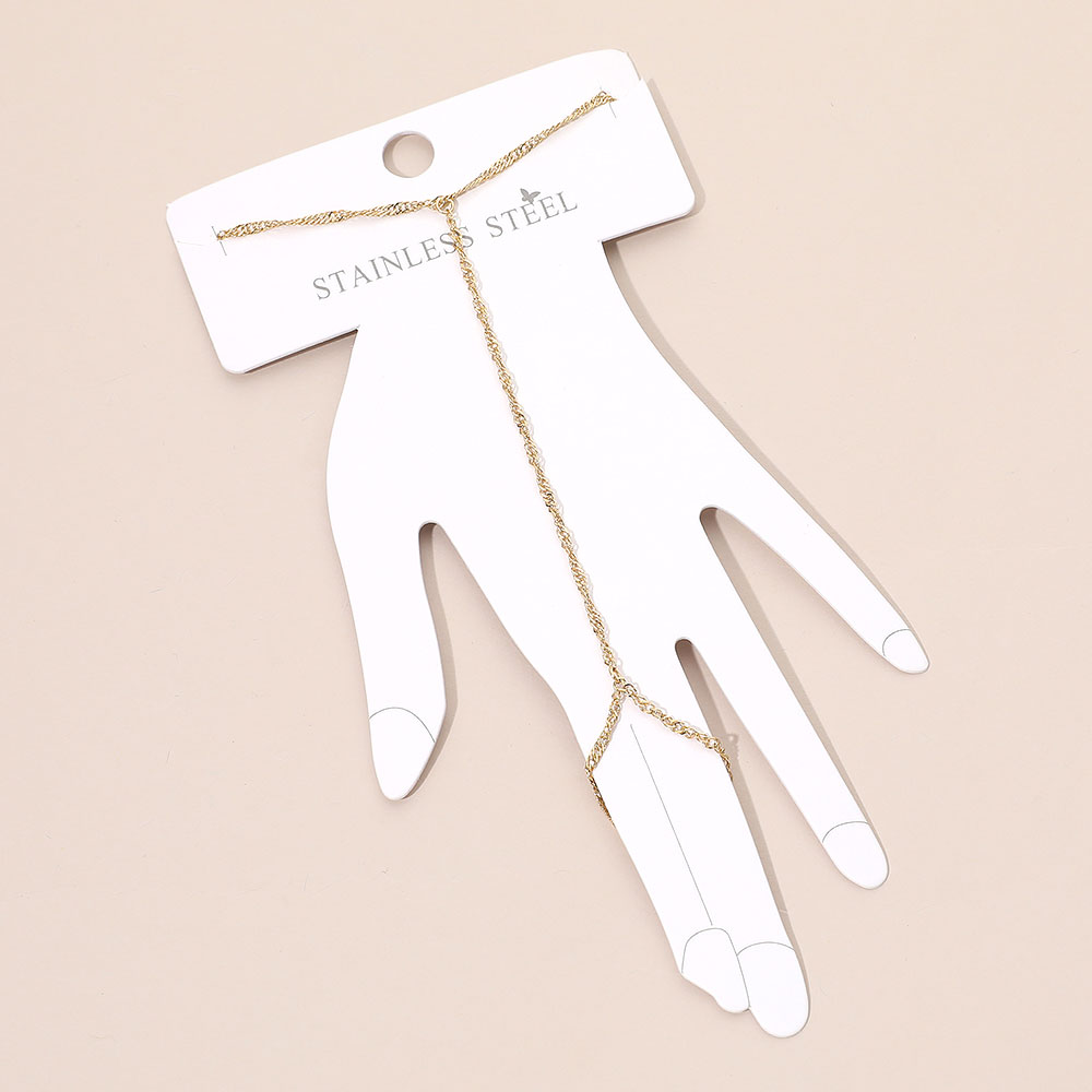 Details • Size : 3.5" H, 6.5" + 1" L • Ring Size : Free • Minimalist rope-style hand chain linking wrist and finger in a graceful, streamlined silhouette for effortless sophistication. Perfect for subtle layering or elegant solo wear, this chic piece enhances everyday outfits and transitions seamlessly into refined evening styling with understated shine. • Stainless Steel