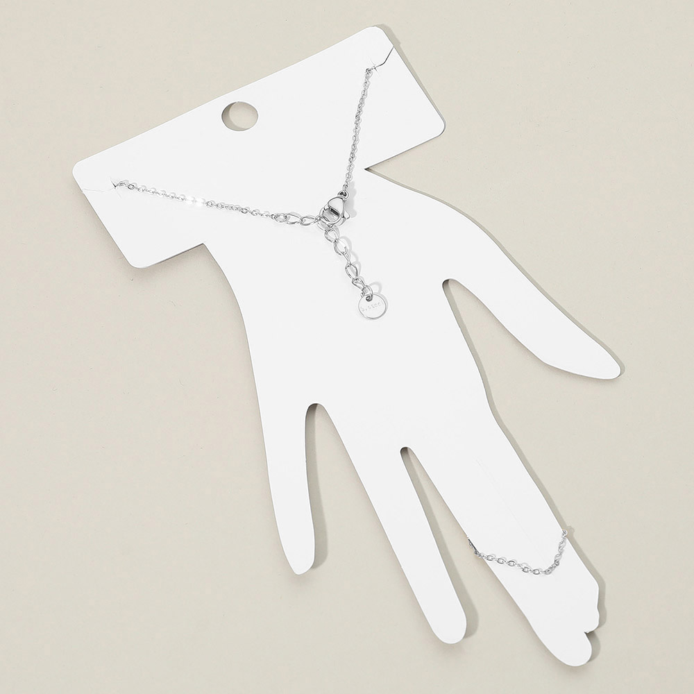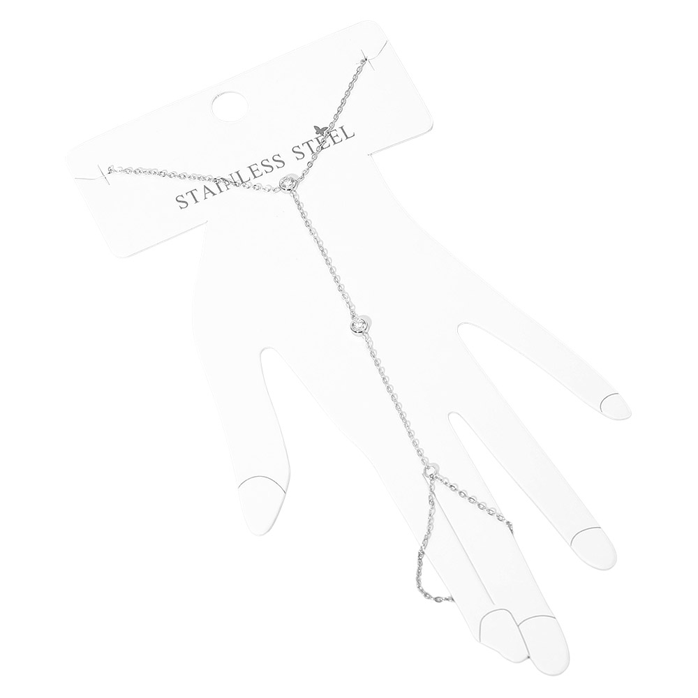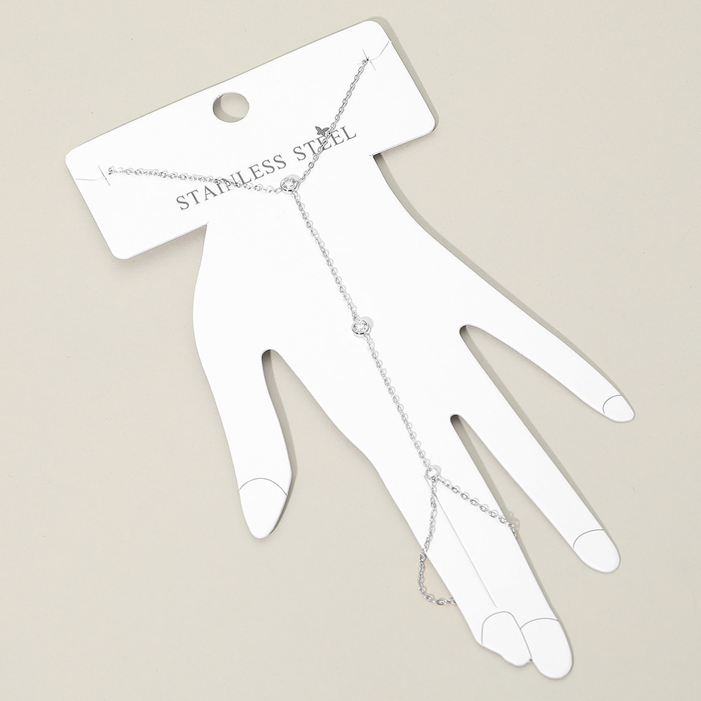 Details • Size : 3.25" H, 6.5" + 1" L • Ring Size : Free • Stylish hand chain bracelet featuring a minimalist linked design that drapes elegantly from finger to wrist. A refined accessory that adds a subtle touch of sparkle, perfect for everyday wear or special occasions. Lightweight, comfortable, and beautifully detailed for a chic look. • Stainless Steel