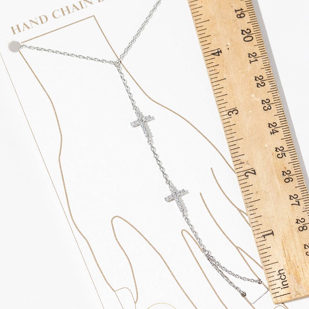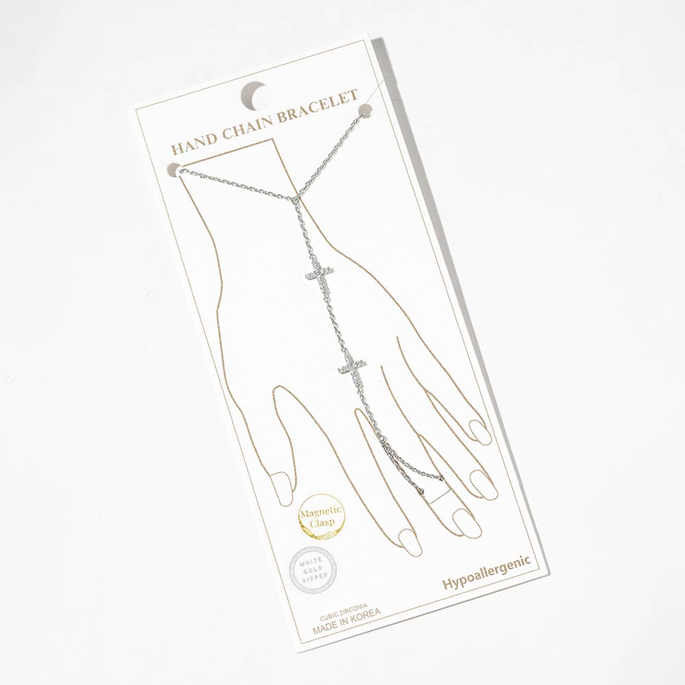 Details • Size : 3.25" H, 7" + 0.25" L • Ring Size : Free • Magnetic Clasp Closure • This elegant hand chain bracelet features a refined cross accent with a connected wrist-to-finger design for a modern, graceful statement. Designed with a convenient magnetic clasp for easy wear, it delivers a sleek layered look that elevates everyday outfits, evening styles, and boutique jewelry collections. Ideal for customers seeking meaningful yet fashion-forward hand jewelry. • CZ Cubic Zirconia • Gold Dipped • Hypoallergenic • Lead and Nickel Compliant • Made In Korea