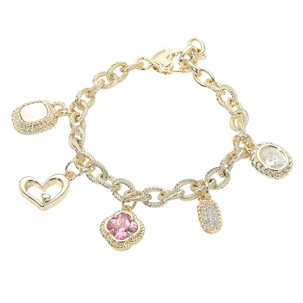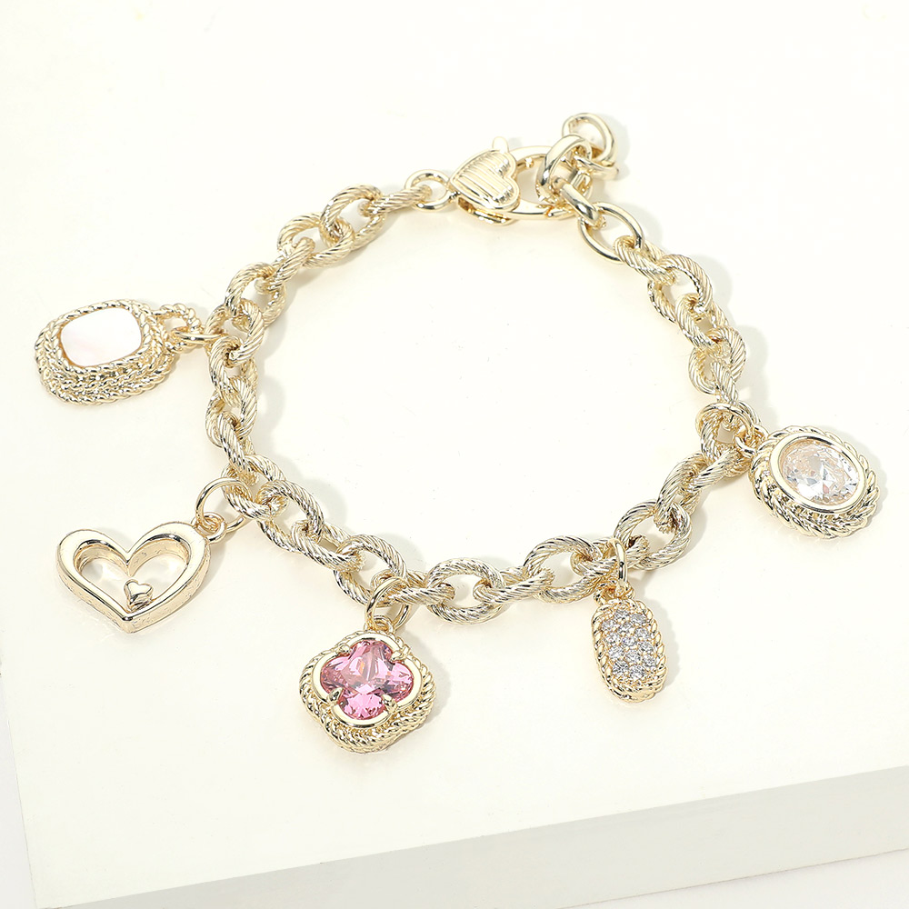 • This charm bracelet features a bold linked chain design accented with multiple decorative charms, including heart shapes and pavĂ©-style details that add movement and visual interest. Designed for statement styling, it offers a balanced mix of playful and elevated elements, making it ideal for gifting, everyday wear, or boutique collections. A versatile bracelet that stands out worn alone or layered with other favorites.