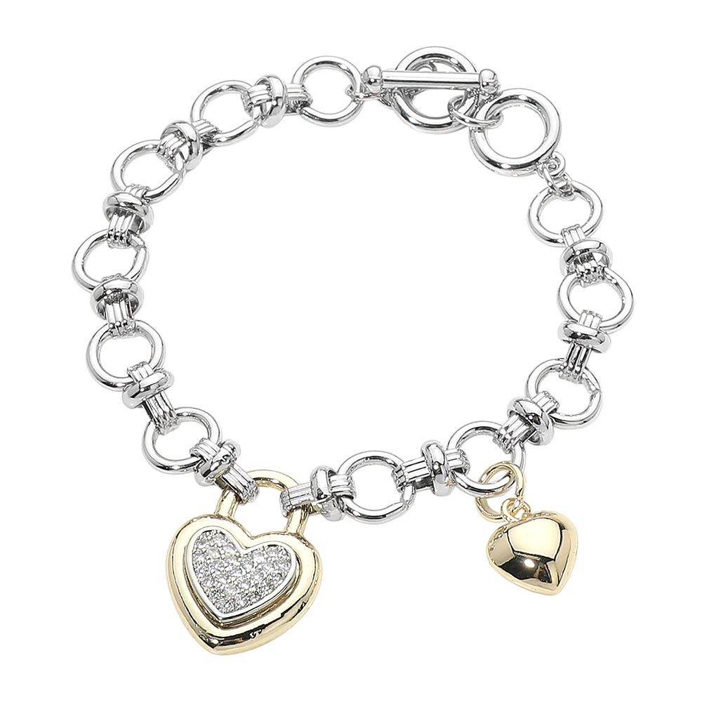 Details • Size : 1" H, 7.5" + 1" L • Toggle Closure • This link bracelet showcases a toggle closure design accented with layered heart charms for a bold yet feminine look. The structured chain silhouette adds visual impact while remaining easy to style for everyday wear or special occasions. A versatile statement accessory ideal for boutiques seeking trend-driven bracelets that attract attention, pair well with layered looks, and enhance curated jewelry collections with modern charm appeal. • Gold Dipped • CZ Cubic Zirconia