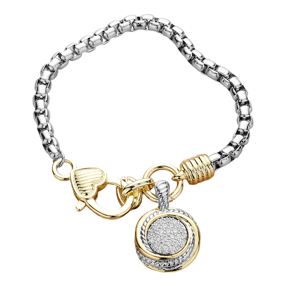 14K Gold Plated Two Tone CZ Stone Paved Round Pendant Bracelet