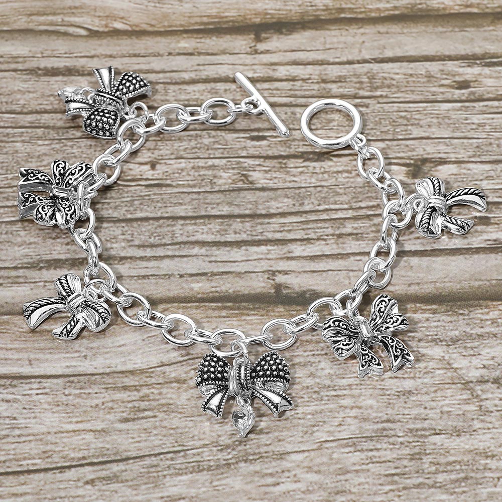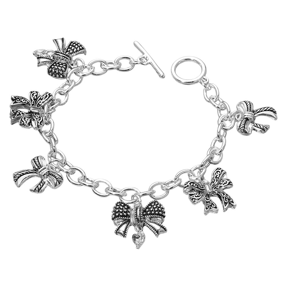 • Add charm and style to your look with this bow charm bracelet featuring detailed ribbon pendants. The chain link design with multiple bow accents offers a playful yet elegant touch, making it a perfect accessory for daily wear or special occasions, ideal for gifting or personal style.