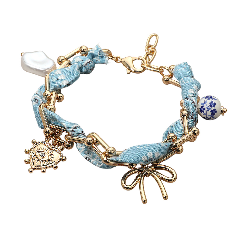 Boho Heart Bow Pearl Evil Eye Charm Station Hardware Chain Fabric Bracelet Boho Heart Bow Pearl Evil Eye Charm Station Hardware Chain Fabric Bracelet