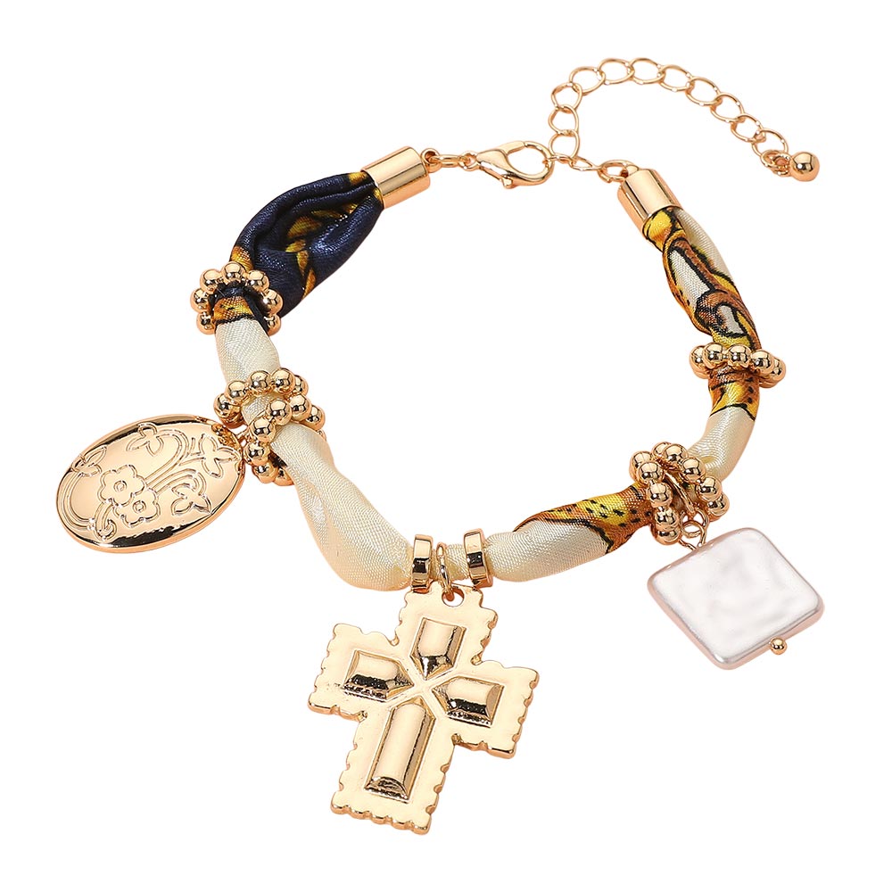 Details • Size : 0.5" H, 7" + 2" L • Charm Size : 1.5" L • Lobster Clasp Closure • Pattern May Vary • Elevate your accessory style with this Charm Pendant Fabric Bracelet, featuring a braided fabric band adorned with gold-tone beads, a cross pendant, and chic charm accents. A perfect blend of modern design and timeless elegance, ideal for both casual and statement looks • Lead and Nickel Compliant