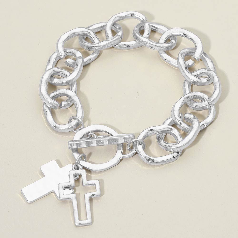 Details • Size : 0.6" H, 8" + 1" L • Charm Size : 1.1" L • Toggle Closure • Statement chain bracelet designed with bold rounded links and a secure toggle closure, finished with layered cross charms for added meaning and style. This bracelet delivers a strong yet refined look, perfect for everyday wear or stacking, offering timeless appeal, symbolic detail, and eye-catching dimension for modern jewelry collections. • Lead and Nickel Compliant