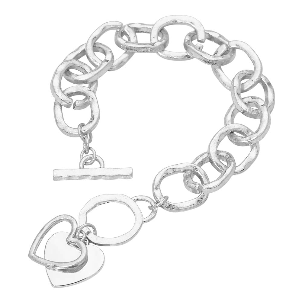 Details • Size : 0.6" H, 8" + 1" L • Charm Size : 1" L • Toggle Closure • Bold chain bracelet featuring oversized rounded links with a secure toggle closure, accented by layered heart charms for a modern yet sentimental look. Designed for statement styling, this bracelet adds dimension and character to everyday outfits, making it ideal for stacking or wearing alone as a standout accessory. • Lead and Nickel Compliant