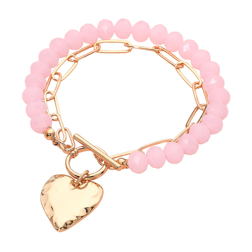 Hammered Metal Heart Charm Beaded Paperclip Chain Layered Toggle Bracelet