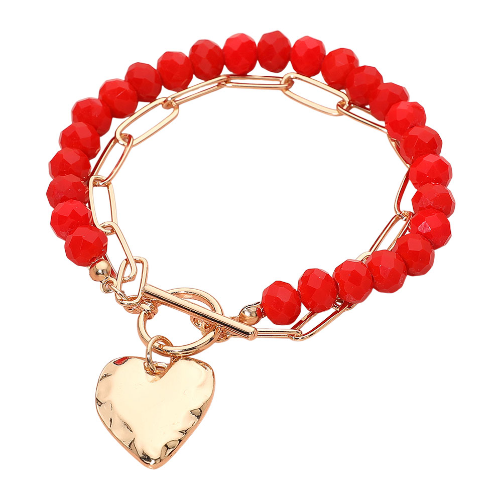 Hammered Metal Heart Charm Beaded Paperclip Chain Layered Toggle Bracelet