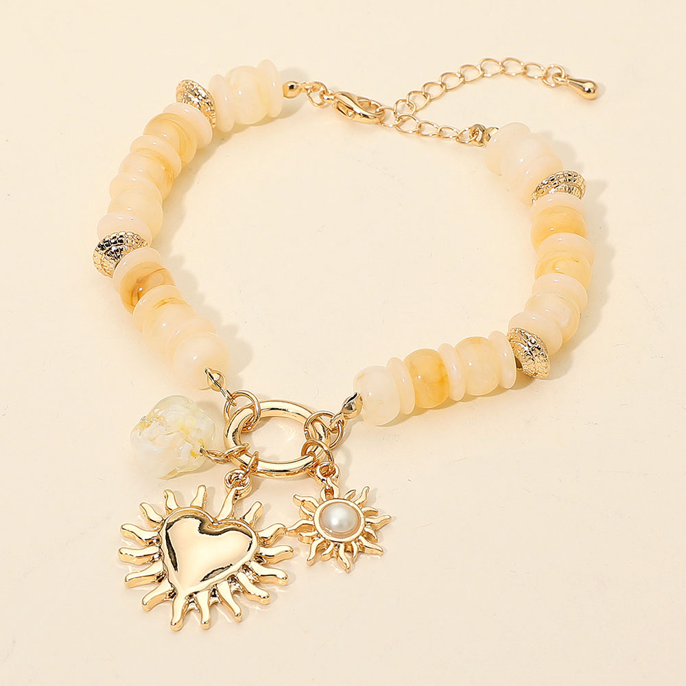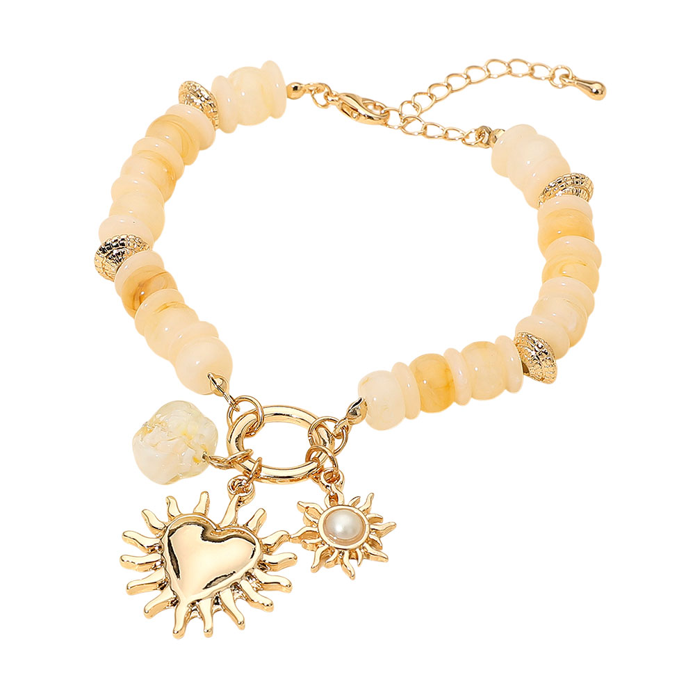 Details • Size : 0.3" H, 7" + 2" L • Charm Size : 1" X 1" • Lobster Clasp Closure • Statement bracelet featuring stacked beads and dangling sun and heart pendants for a bold yet versatile accent. Designed with an adjustable fastening for easy wear, it layers beautifully with other pieces or stands alone as a signature everyday accessory. • Lead and Nickel Compliant