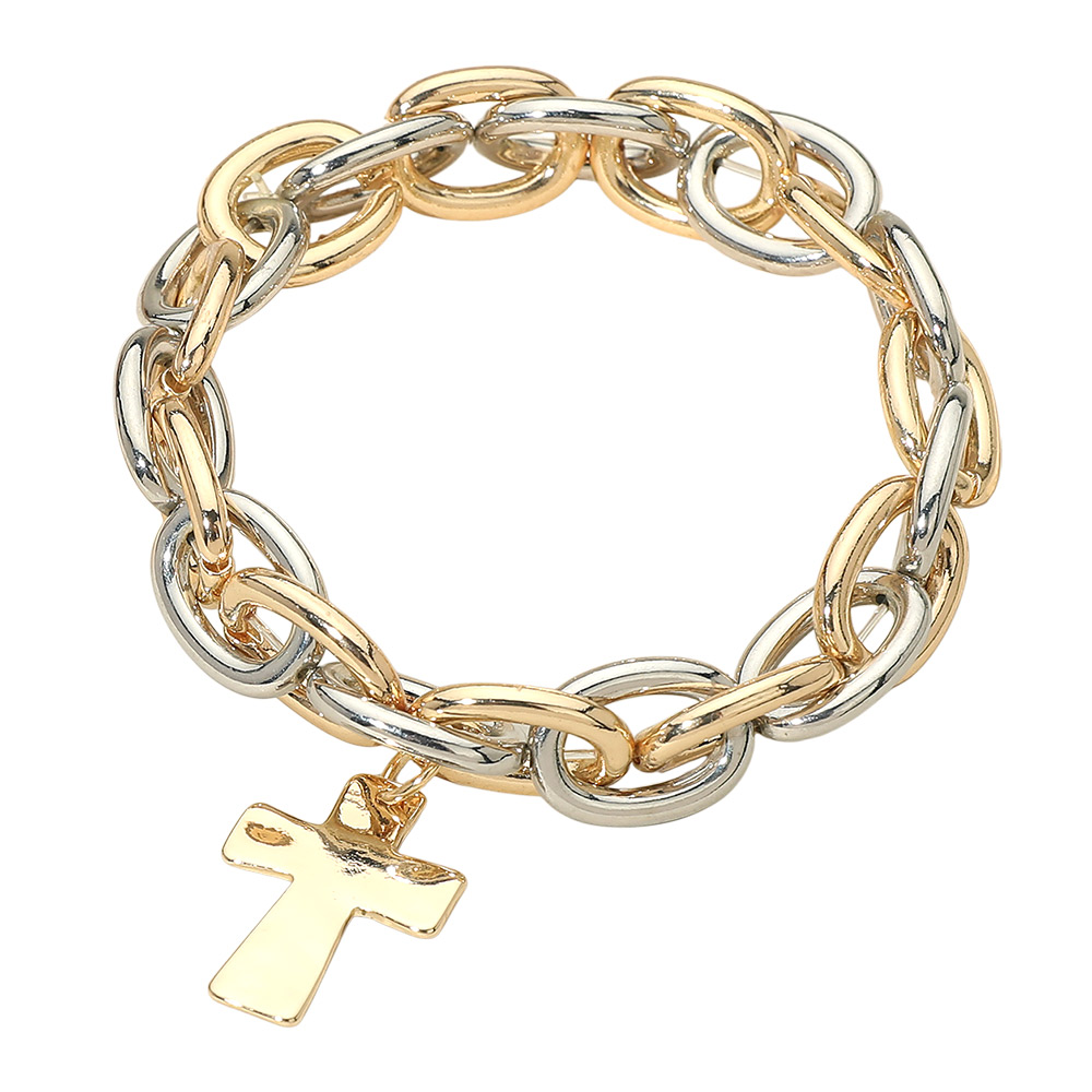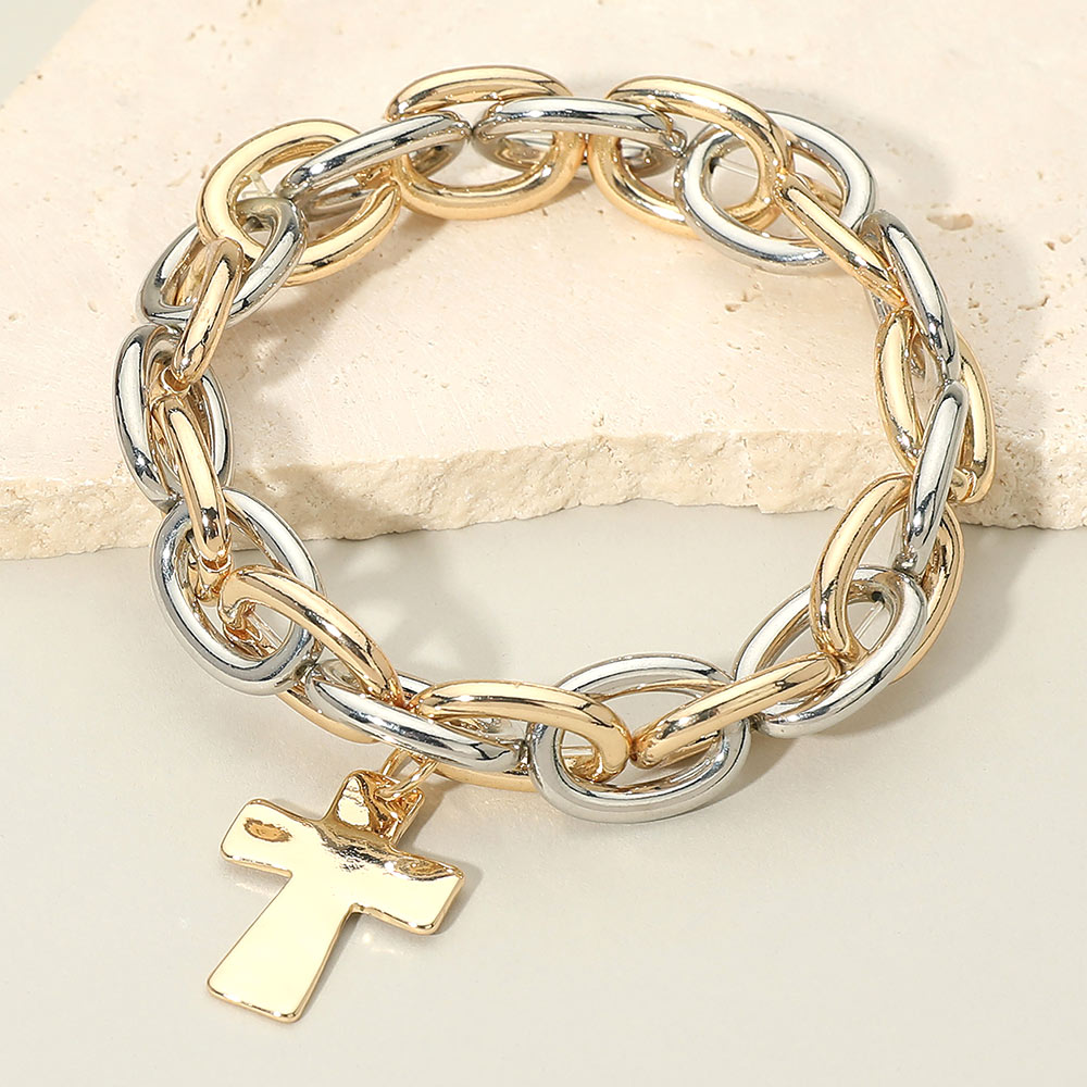 Metal Cross Charm Chunky Chain Link Stretch Bracelet