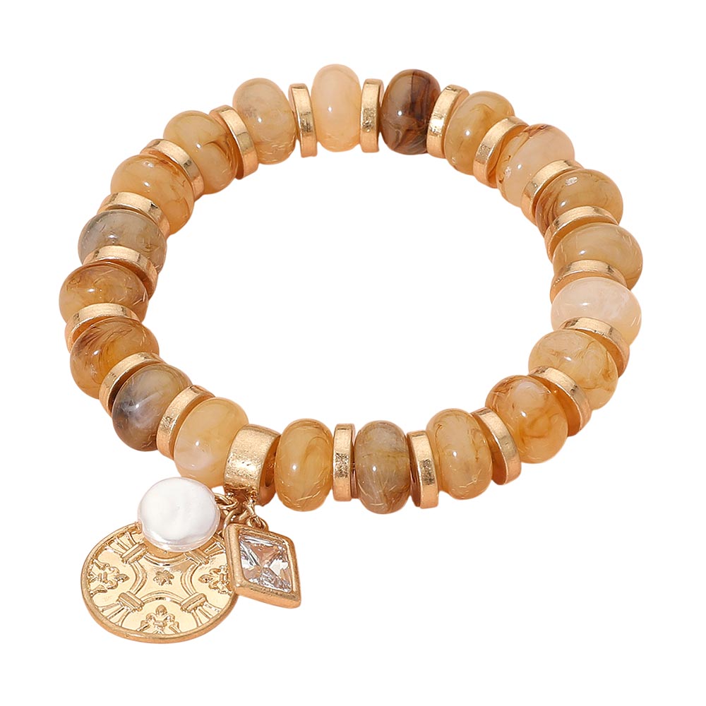 • This beaded stretch bracelet features polished round beads accented with metallic spacers and finished with charming pendants, including a coin, pearl, and crystal detail. Its versatile design makes it a stylish piece for layering or wearing solo for a chic statement.