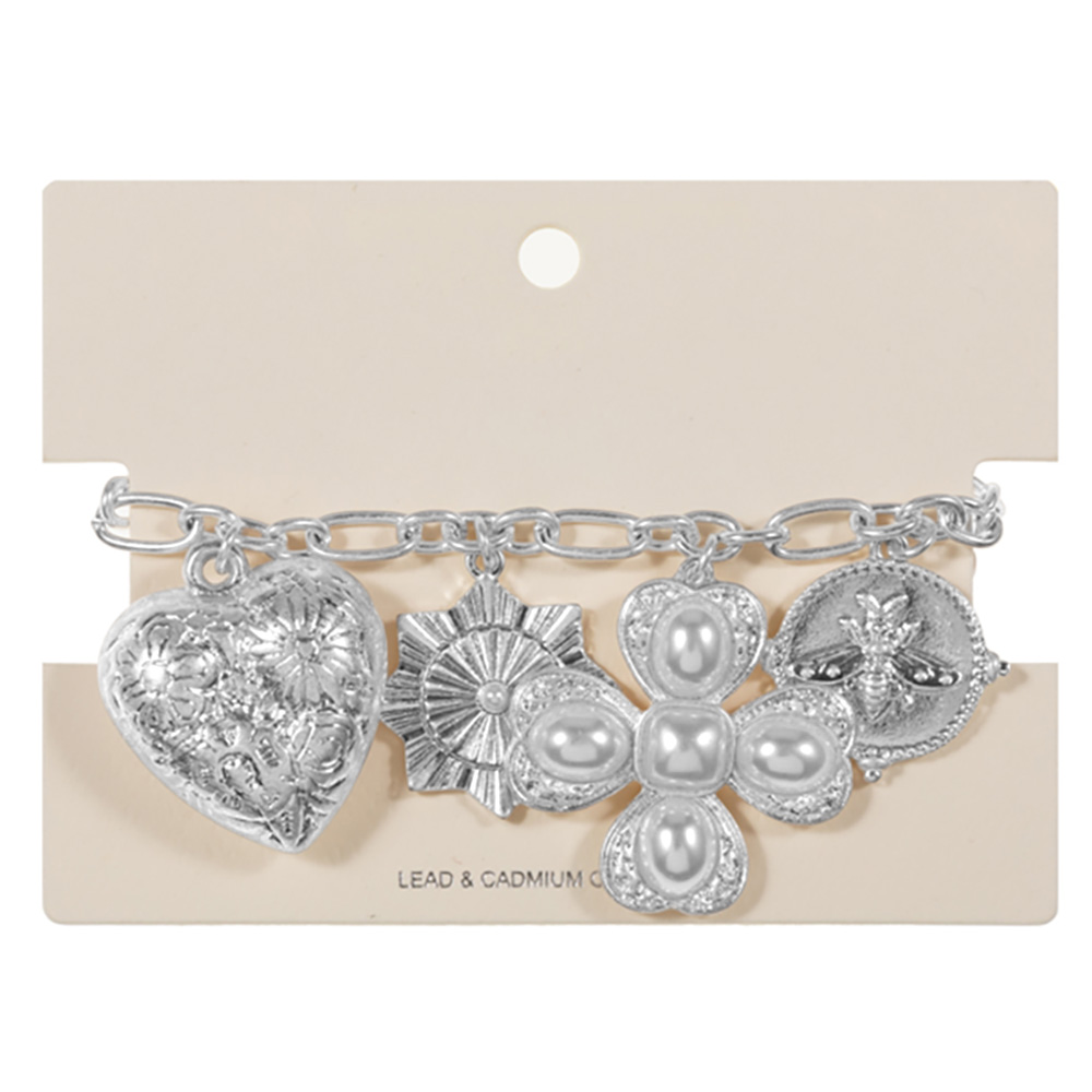 Pearl Clover Metal Heart Honey Bee Medal Charm Station Bracelet