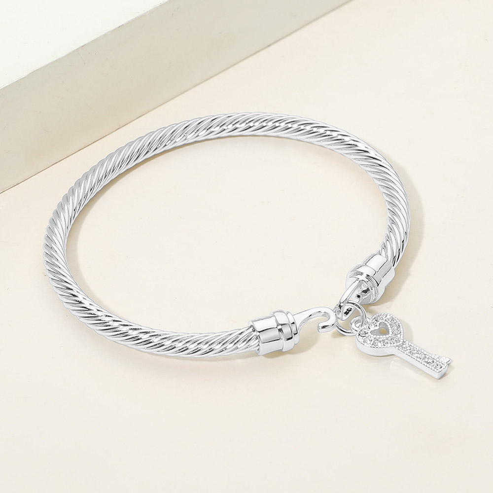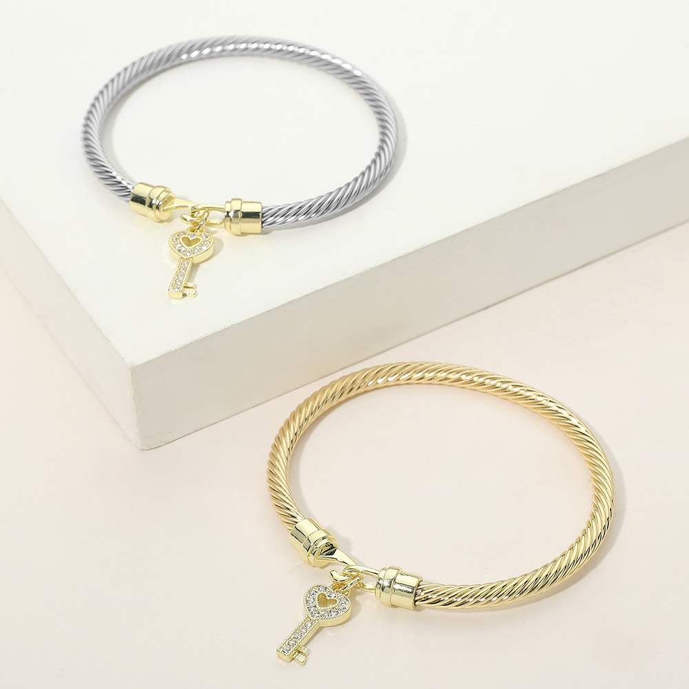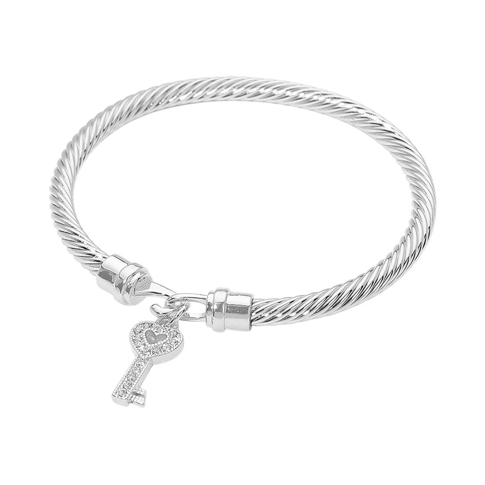 Details • Size : 0.2" H, 2.25" D • Charm Size : 0.5" L • Hook Closure • This key charm cable style bracelet features a sleek, structured design accented with a symbolic dangling key for a meaningful, stylish touch. Designed for everyday wear or special occasions, it offers a secure fit and timeless appeal, making it ideal for gifting, stacking, or boutique jewelry collections that focus on modern elegance. • CZ Cubic Zirconia