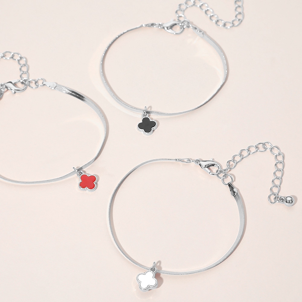 Details • Size : 7.5" + 3.25" L • Charm Size : 0.3" X 0.5" • Lobster Clasp Closure • This minimalist charm chain bracelet features a sleek quatrefoil shaped pendant on a slim chain with an adjustable extension for a comfortable fit. Designed for effortless everyday wear, it layers easily with other bracelets and adds subtle charm to casual, work, or gift ready accessory collections for boutiques and online shops. • Sterling Silver Dipped • Lead and Nickel Compliant