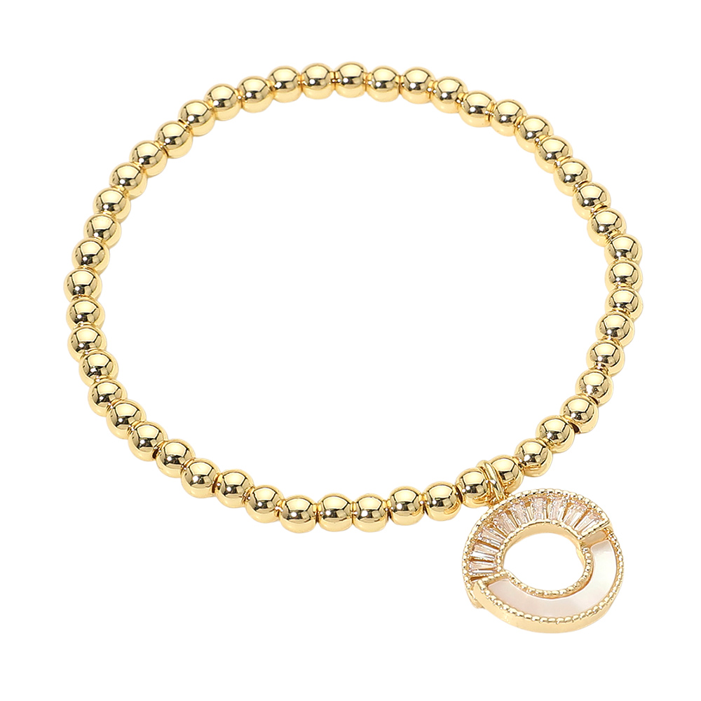 Stainless Steel CZ Pave Mother of Pearl Detail Open Circle Charm Beaded Stretch Bracelet