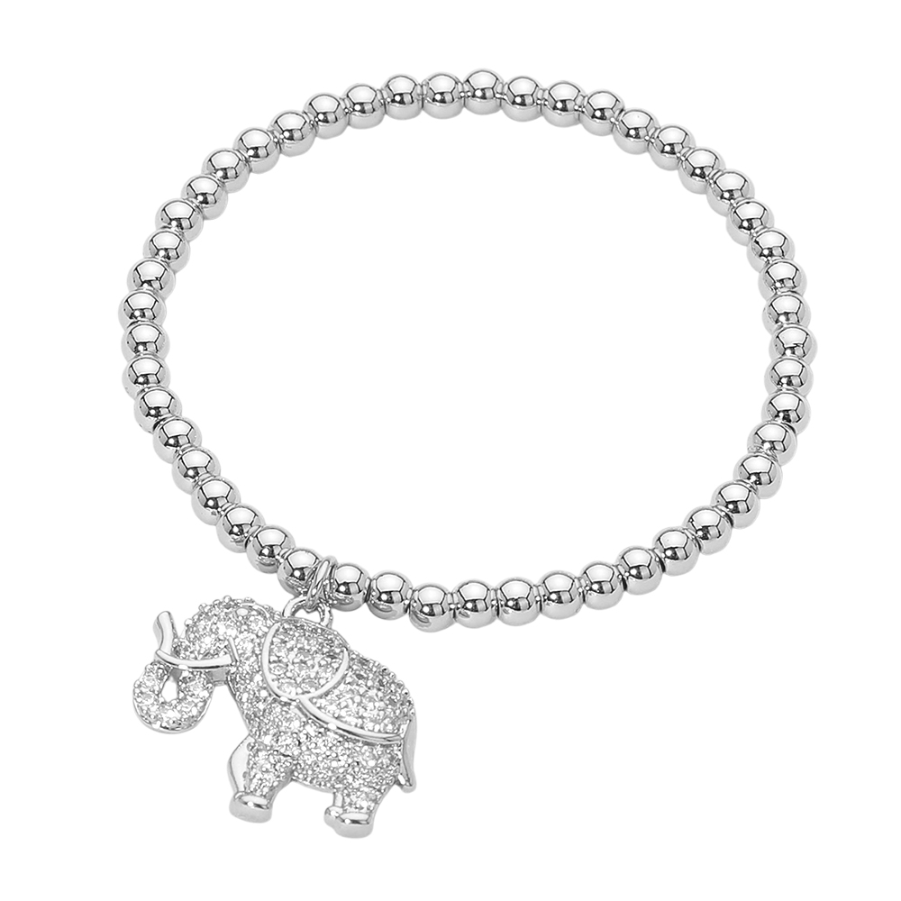 Stainless Steel CZ Stone Paved Elephant Charm Beaded Stretch Bracelet