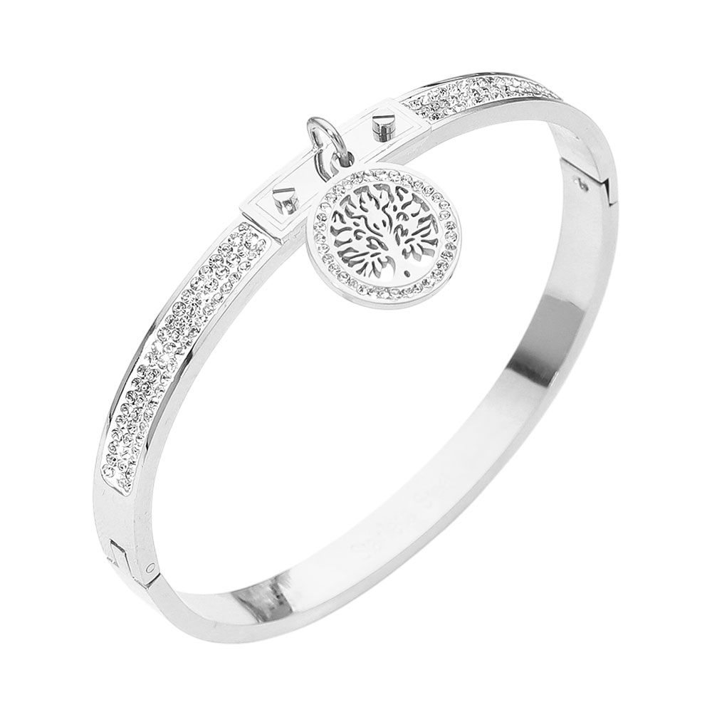 Stainless Steel Tree of Life Charm Accent CZ Stone Paved Hinged Bangle Bracelet