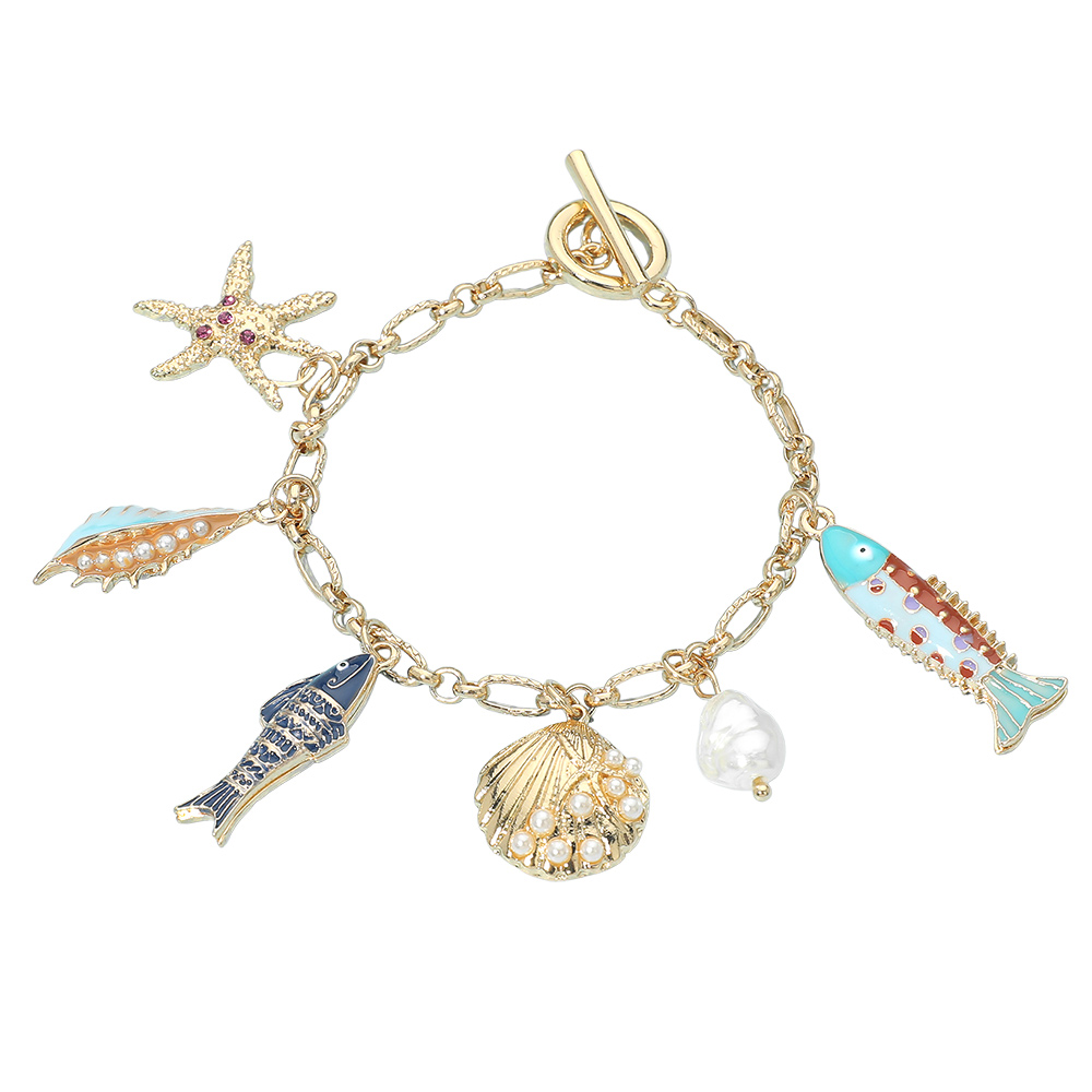 Details • Size : 0.2" h, 7" + 0.5" L • Charm Size : 0.7" - 1.3" L • Toggle Closure • Playful ocean-inspired charm bracelet featuring a secure toggle closure and detailed sea-themed accents. Designed with linked structure for comfortable wear and eye-catching movement. Perfect for summer styling, vacation looks, or everyday outfits, this charm bracelet adds personality and storytelling appeal. Ideal for gifting, resort collections, and curated accessory assortments focused on fun, symbolic design and statement details. • Lead and Nickel Compliant