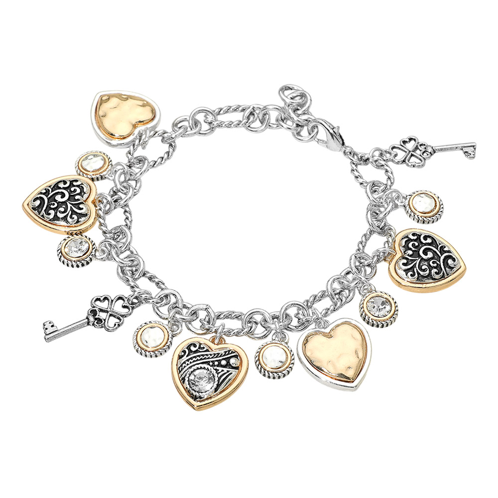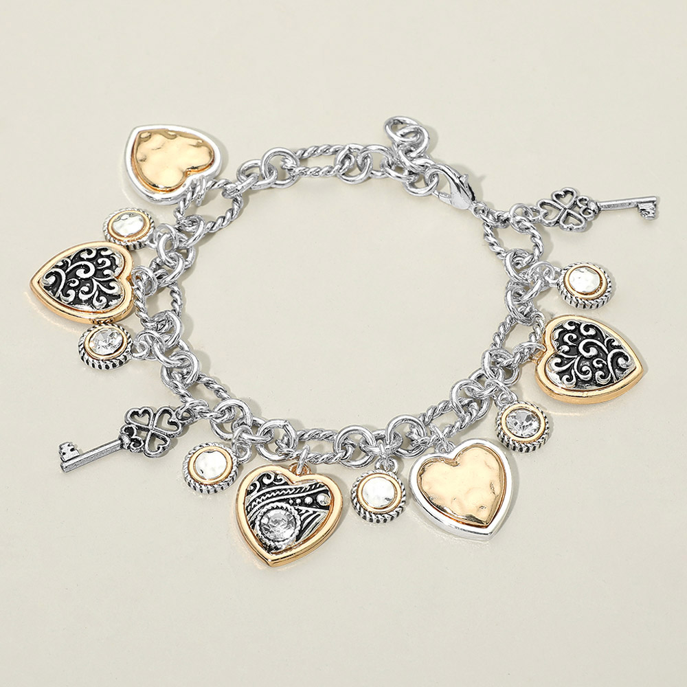 Two Tone Antique Metal Heart Clover Key Stone Charm Station Bracelet